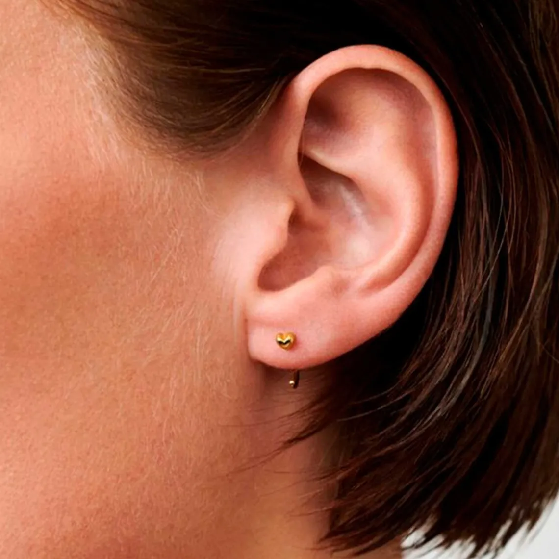 Smukke creoler med et lille, chunky hjerte, der diskret titter frem på øret. Hjertet måler 3,5 mm, og selve creolen har en diameter på 9 mm. Den blanke overflade reflekterer lyset elegant i de buede kanter og giver et sofistikeret look. Brug dem alene eller kombiner med andre øreringe for et personligt udtryk. Materiale: 100% certificeret genanvendt sterlingsølv, forgyldt med 18 karat guld