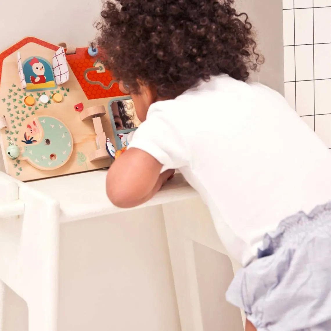 Åbn vinduerne, drej på hjulet eller hjælp fuglen ned fra taget. Bondegården er fyldt med aktiviteter og kombinationen af træ og stof giver også stimulation til følesansen.