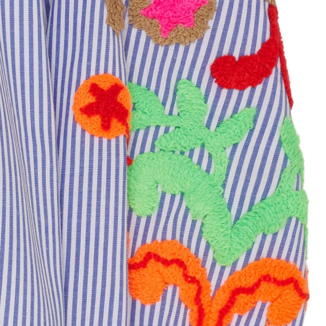 Stribet skjorte fra Marta Du Chateau med blå og hvide lodrette striber. Broderede blomsterdetaljer på ærmerne og snørelukning ved halsen giver skjorten et feminint og elegant udtryk. Materiale: 55% polyester, 42% bomuld, 3% elastan