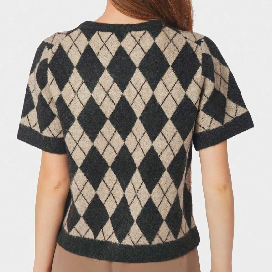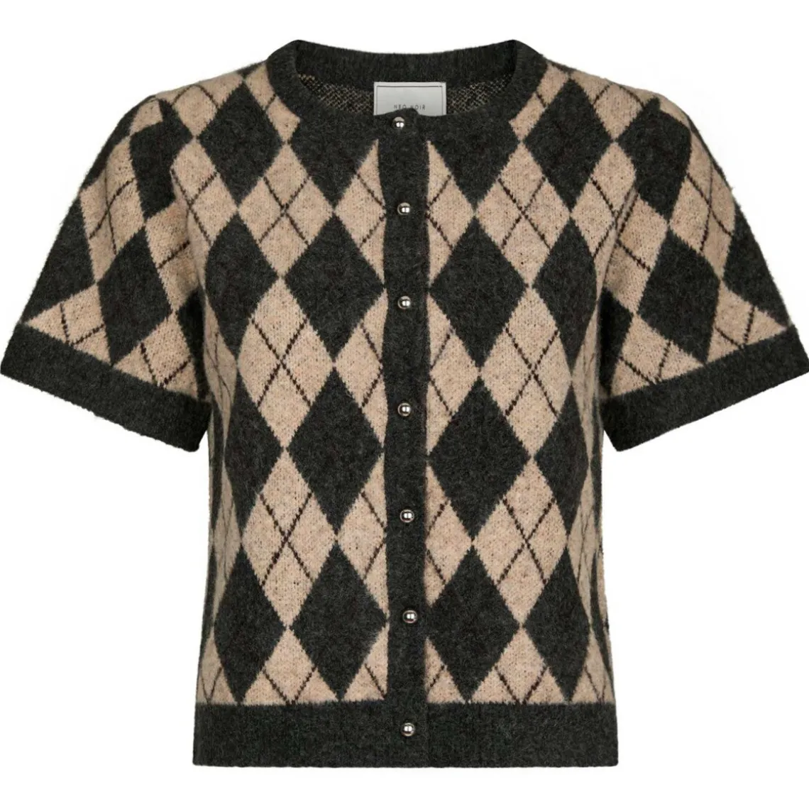 Smart strikket cardigan med et klassisk argyle-mønster, der tilføjer et moderne twist til et tidløst look. Cardiganen har korte ærmer og knaplukning foran, hvilket gør den nem at style både over bluser og kjoler. Perfekt til lag-på-lag-look eller som et selvstændigt statement-piece. Materiale: 47% polyester, 40% akryl, 10% uld, 3% elastan