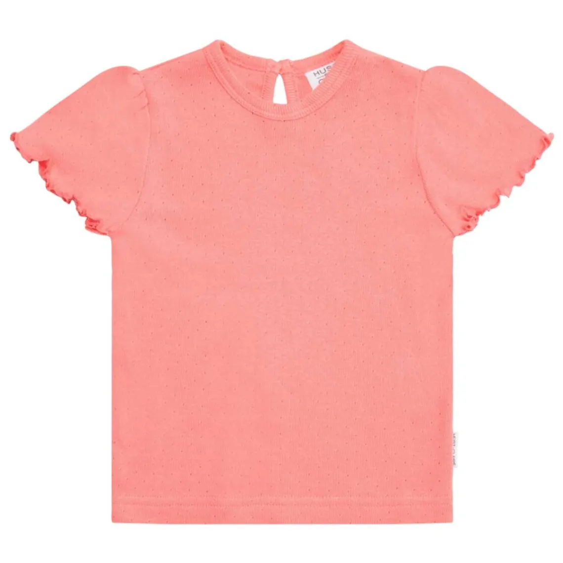 Alma T-shirt fra Hust and Claire. Her får du en sød, ensfarvet T-shirt med lidt hulmønster. Denne T-shirt er med korte ærmer, som afsluttes med en lille fin kant. T-shirten lukkes med en enkelt knap i nakken.
