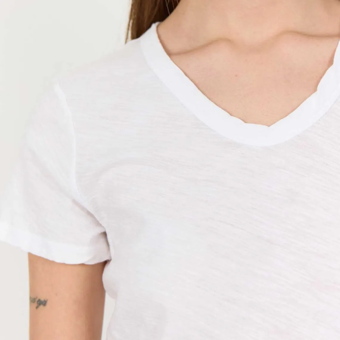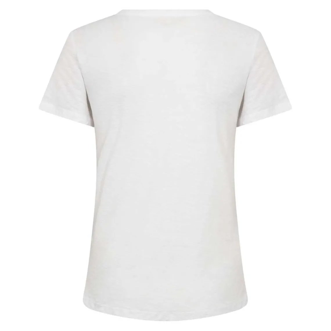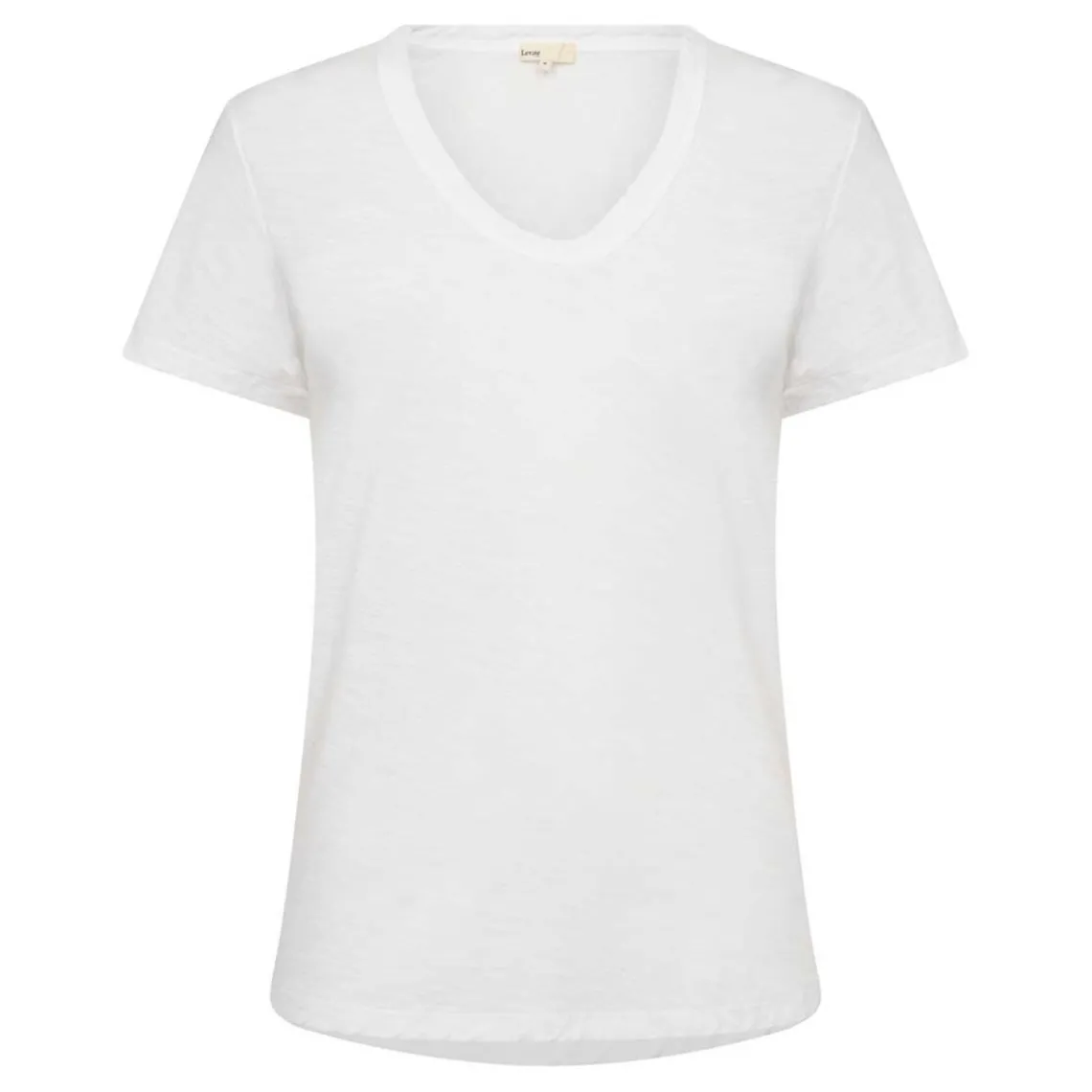 Denne klassiske t-shirt kombinerer tidløs stil med feminin elegance. Den er designet med en smigrende v-udskæring og korte ærmer, hvilket giver et let og sofistikeret look. Det enkle, men effektive design gør den utrolig alsidig og til et must-have i enhver garderobe – perfekt til både hverdagens afslappede look og som basis i et mere opsat outfit.
