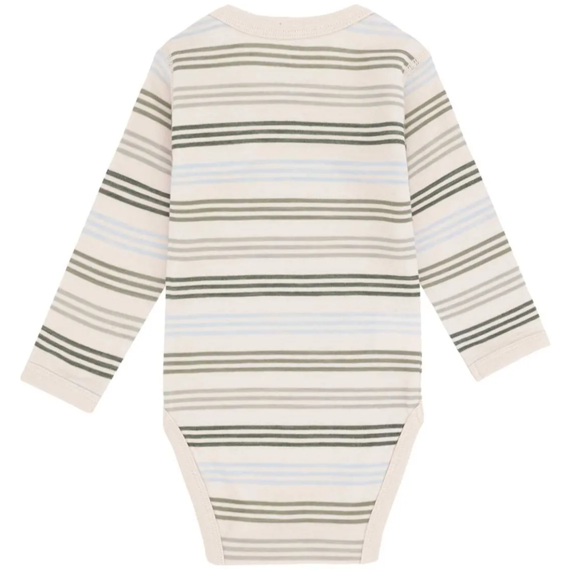 Blød Hust and Claire bodystocking i beige med et stribet design i blå og grønne nuancer. Bodystockingen har rund halsudskæring med trykknapper på venstre skulder samt lange ærmer. Den lukkes med trykknapper mellem benene og er lavet i en blød blanding af uld og bambusviskose, som føles behagelig mod huden. Materiale: Uld, bambus, polyamid, viskose
