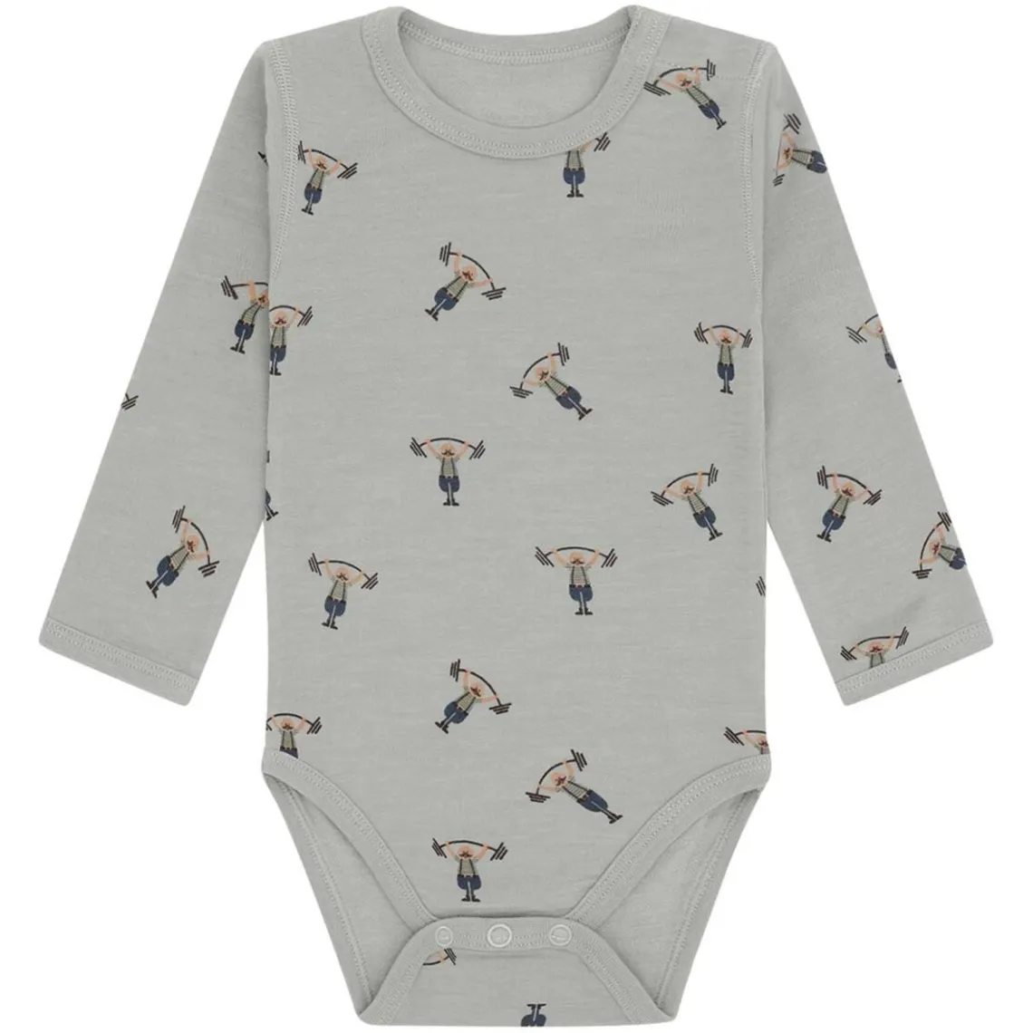 Smuk Hust and Claire bodystocking i støvet grøn med et allover print af små vægtløftere. Bodystockingen har en rund halsudskæring med trykknapper på venstre skulder og lange ærmer. Den lukkes med trykknapper mellem benene for nem på- og afklædning. Materiale: Uld, bambus, polyamid, viskose