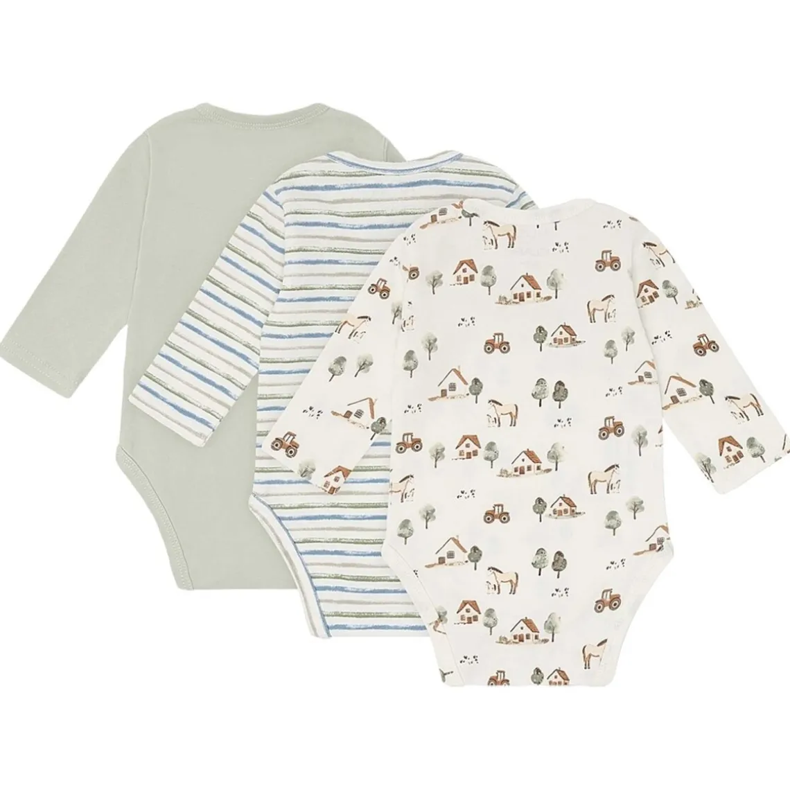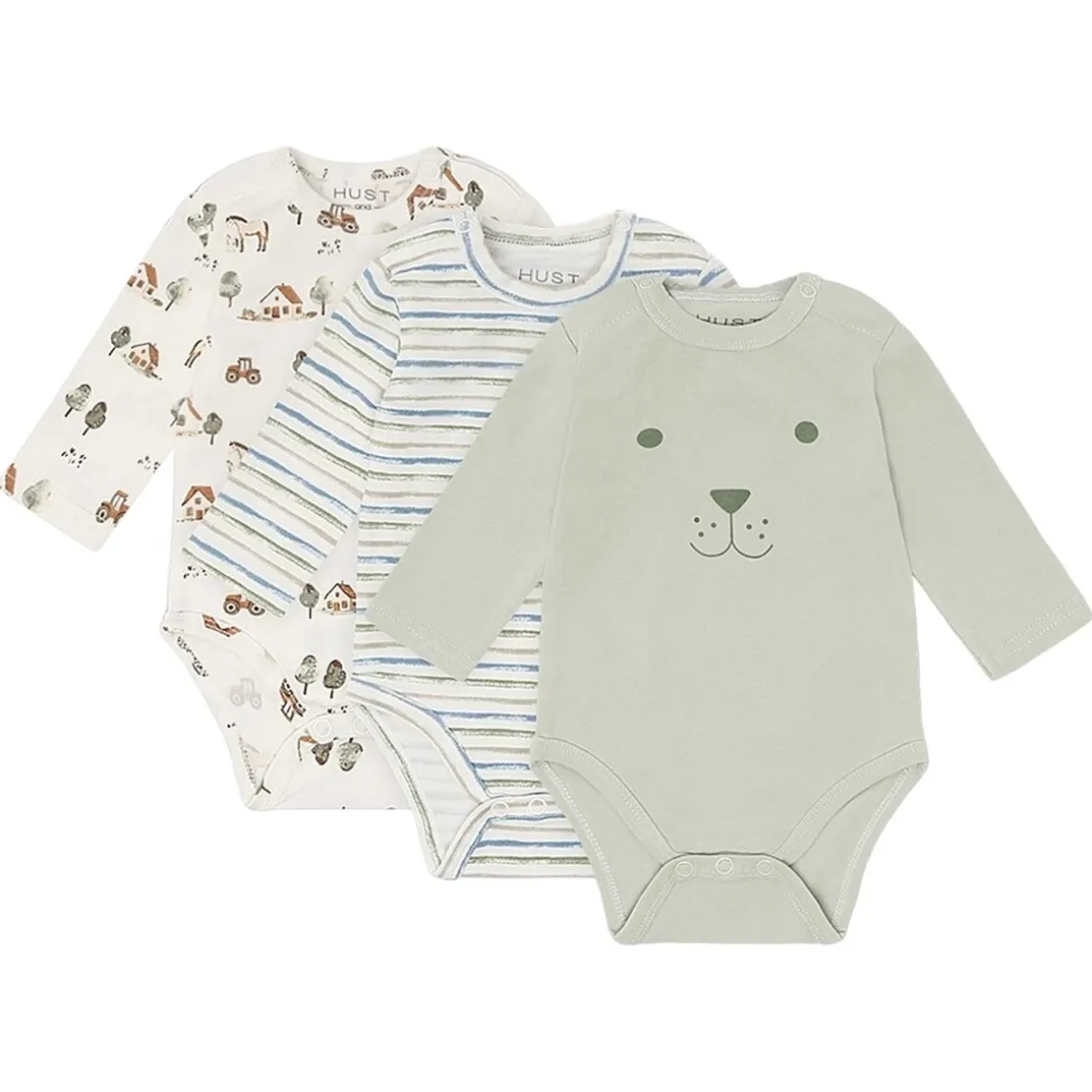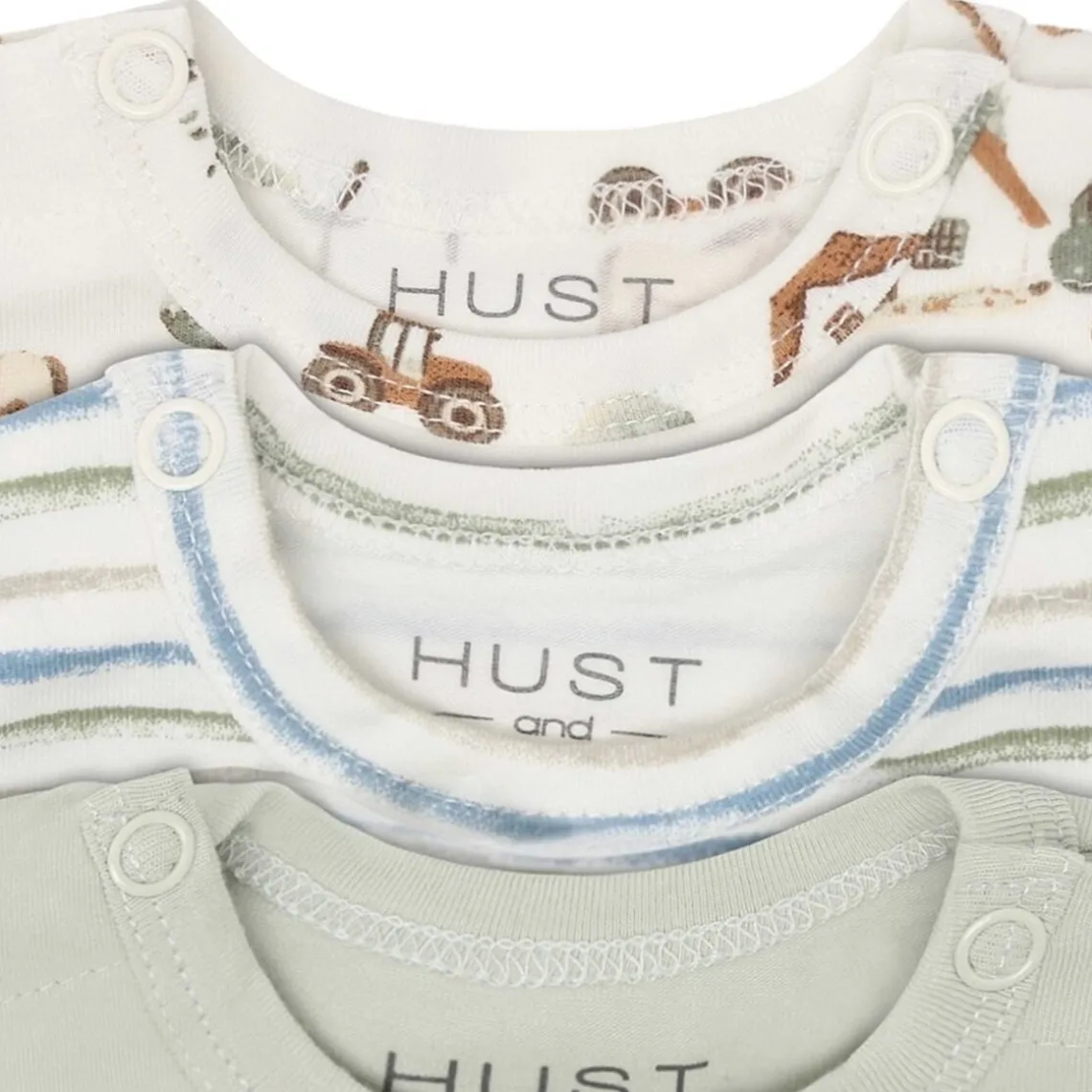 Denne 3-pak bodystocking fra Hust And Claire består af tre babybodyer med varierede, legende designs i rolige grønne nuancer. Sættet er velegnet til både hverdagsbrug og som basis i barnets garderobe. Bodyerne er fremstillet i en blød og åndbar bomuldsblanding, der føles behagelig mod sensitiv babyhud og giver god bevægelsesfrihed. Den elastiske kvalitet gør bodyerne nemme at tage af og på og praktiske i forbindelse med bleskift, hvilket gør dem ideelle til daglig brug. Materiale: 95 % bomuld, 5 % elastan