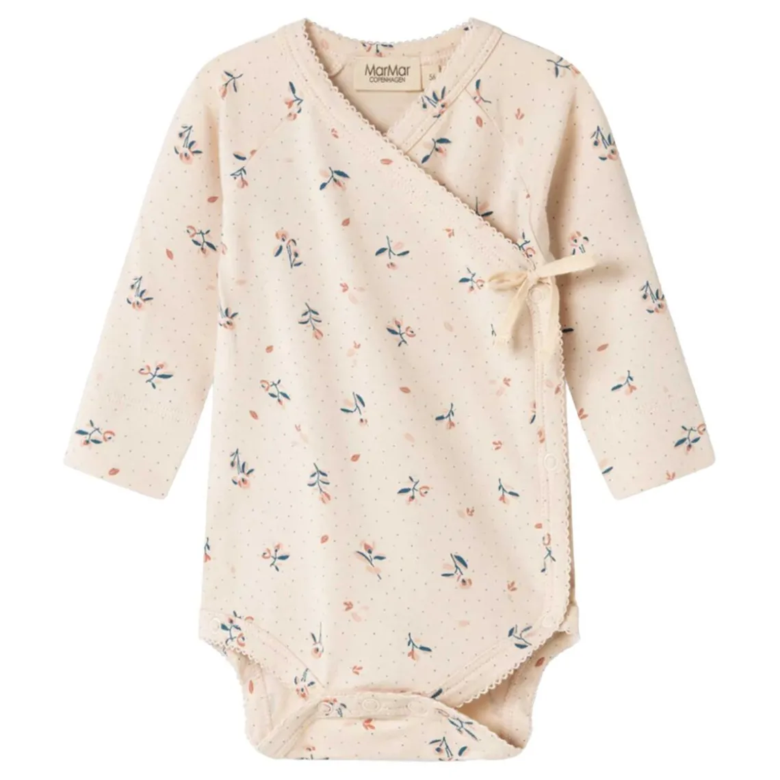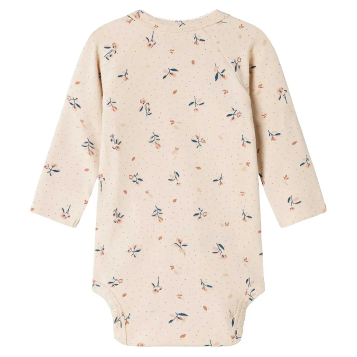 Langærmet bodystocking til nyfødte med slå-om-lukning, bindebånd og sødt print. Bodystockingen har fine picotkanter og lukkes med trykknapper. Den er både blød, strækbar og behagelig at have på. Materiale: 47% modal, 48% økologisk bomuld, 5% elastan