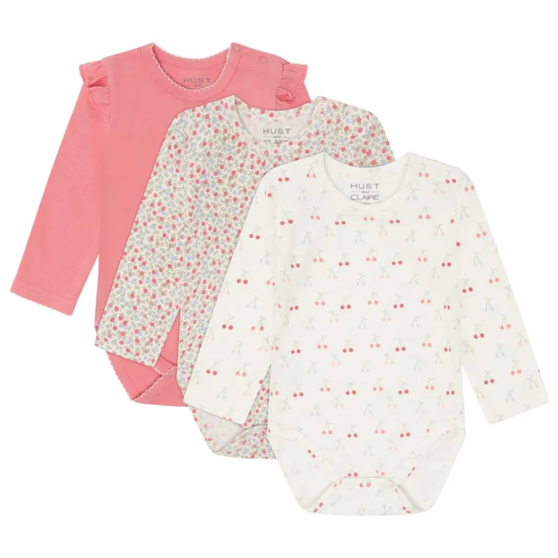 Fine Hust and Claire bodyer solgt i en praktisk 3-pak. Sættet indeholder én ensfarvet mørk rosa body med hvide syninger i kanterne og fine flæser ved skuldrene, én hvid body med et sødt blomsterprint i pink, blå og grøn samt én hvid body med kirsebærprint i rosa, blå og grønne nuancer.