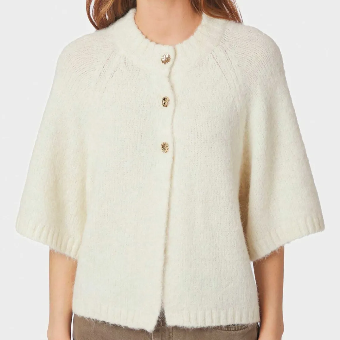 Boxy strikcardigan – en elegant cardigan med vidde på ærmerne og smukke knapper foran. Den bløde, fluffy kvalitet giver et luksuriøst og komfortabelt look. Materiale: 70% polyester, 21% nylon, 8% uld, 1% elastan