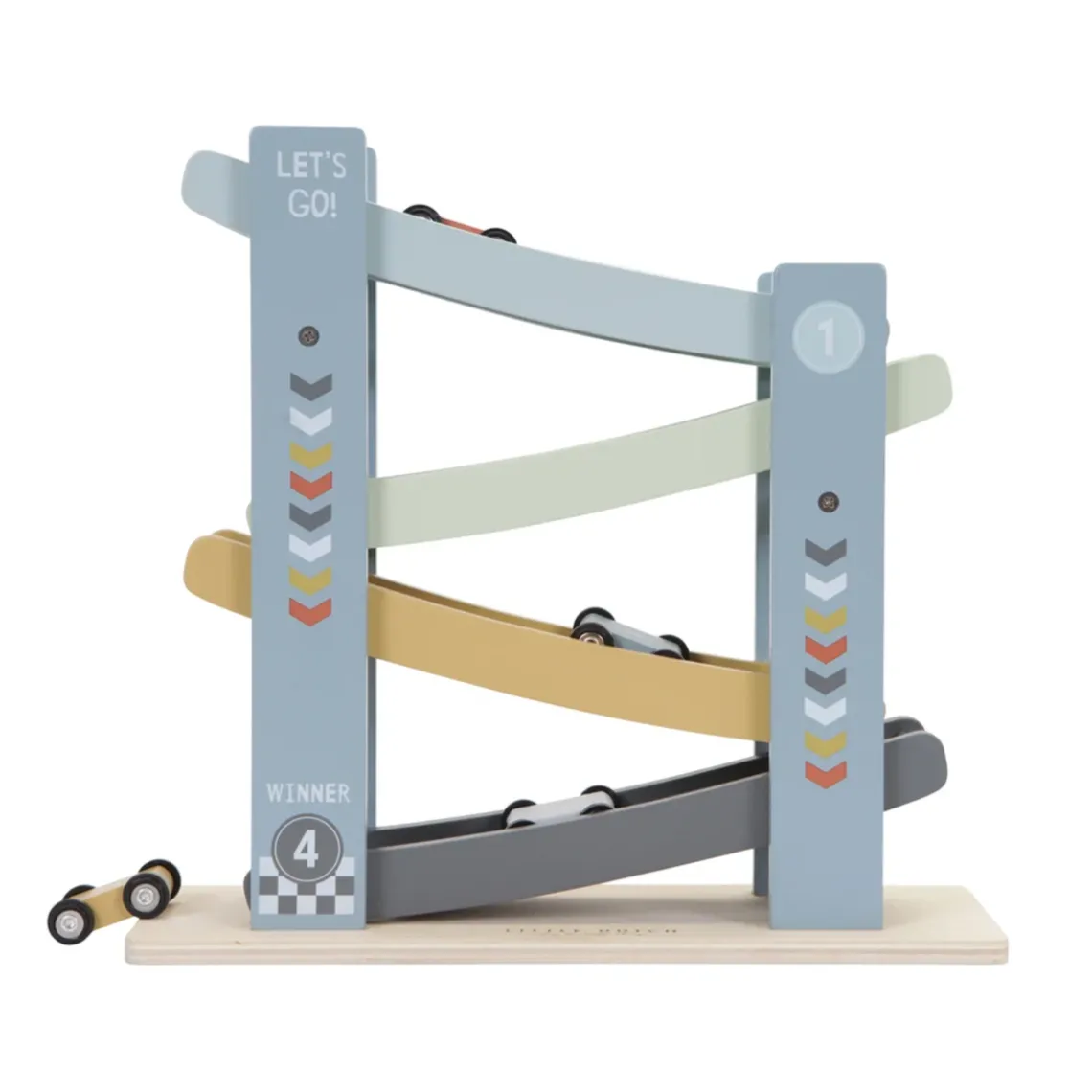 Klar, parat, KØR! Denne fine racerbane i træ byder på timevis af underholdning for de mindste. Med 4 små racerbiler medfølgende er det bare at sætte dem øverst på banen, give slip – og se dem suse nedad i fuld fart! En leg, der både begejstrer og stimulerer barnets motorik og nysgerrighed.
