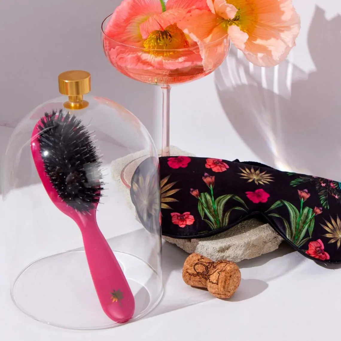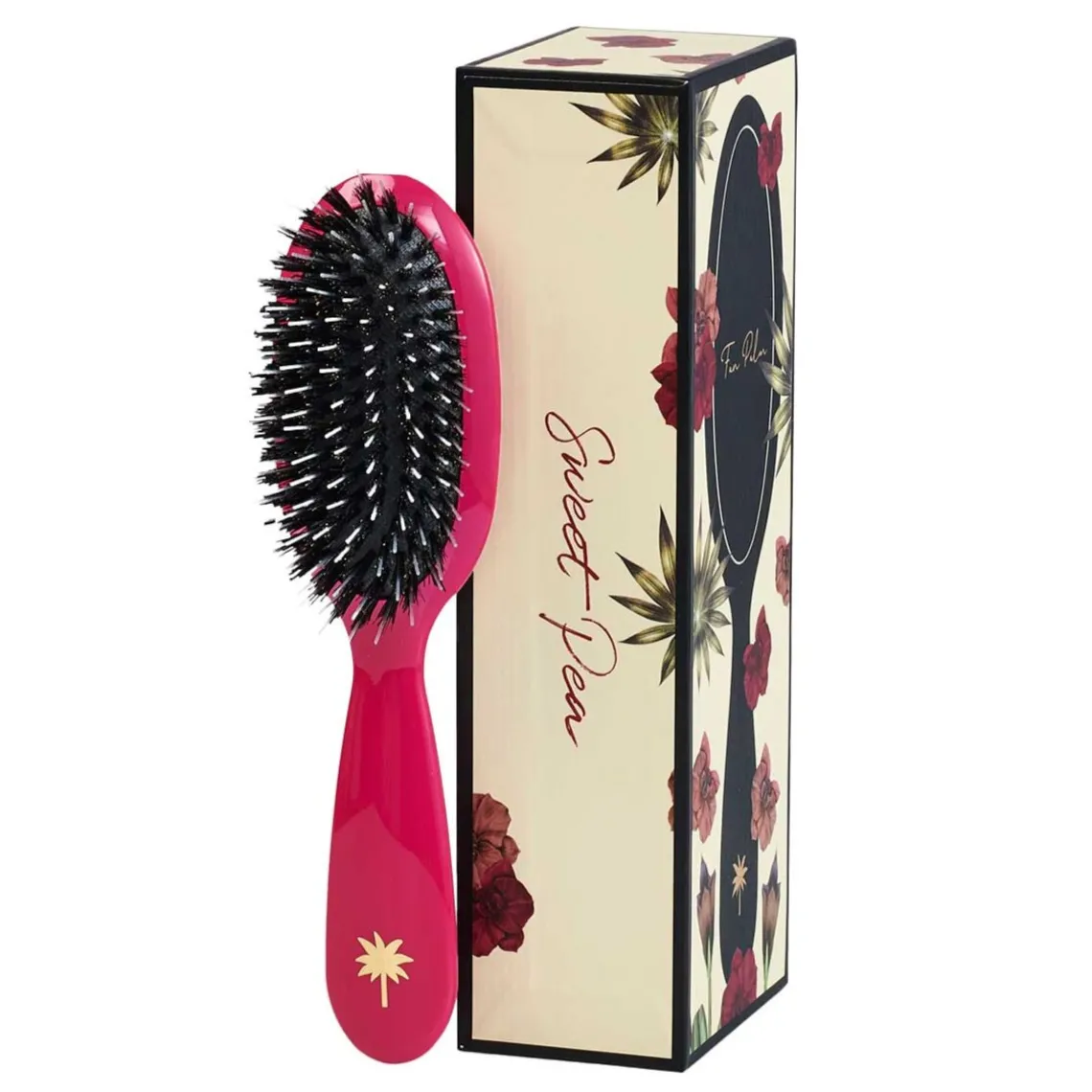 Fan Palm Hårbørste – Denne luksuriøse hårbørste kombinerer boar- og nylonbørster for at give glansfuldt og blødt hår. De længere nylonbørster stimulerer hovedbunden og løsner skånsomt knuder, mens boarbørsterne fordeler sebum jævnt. Børsten fremmer blodcirkulationen til hårsækkene, og mange oplever, at den kan forlænge tiden mellem hårvaske til hver tredje eller fjerde dag. Leveres i en smuk skuffebox med elegante guldfolie-detaljer. Materialer: Boar, nylon