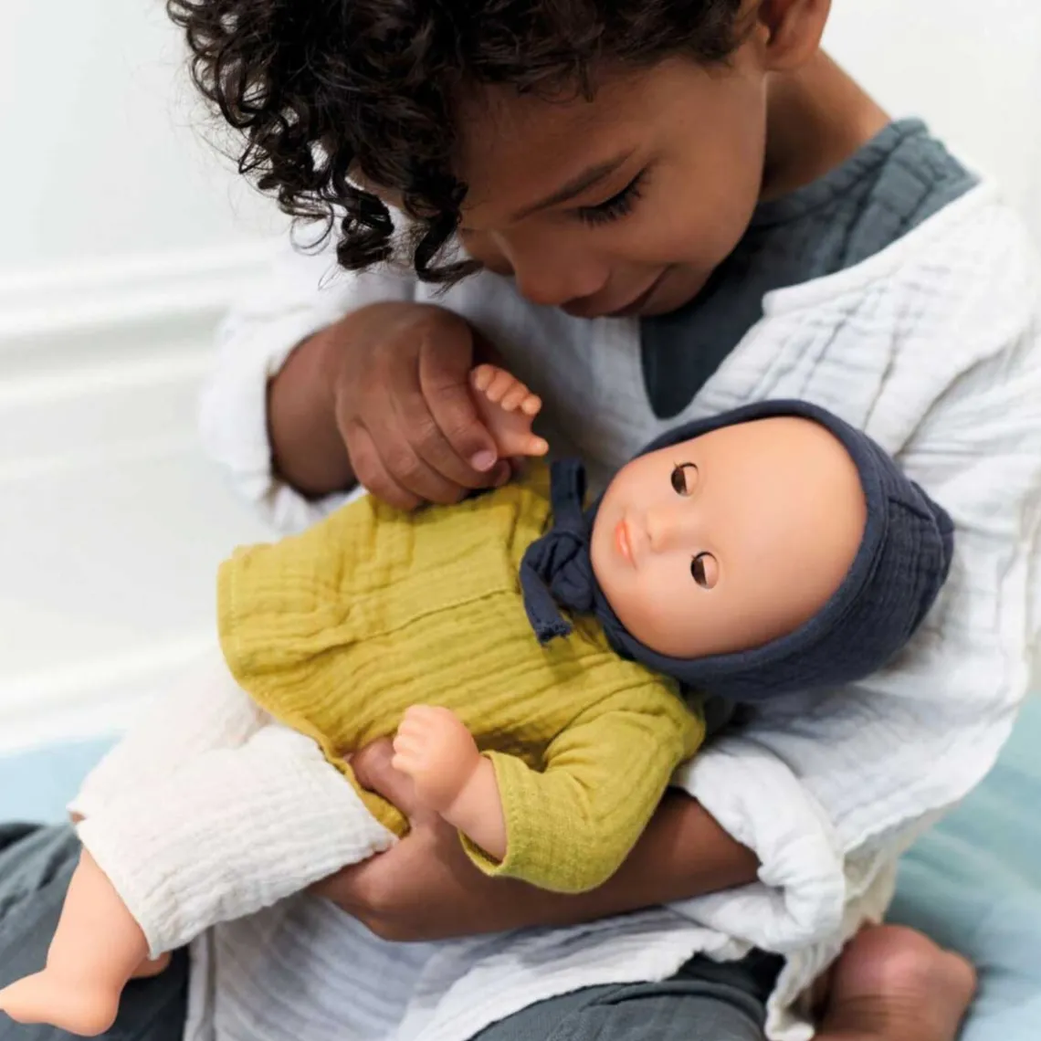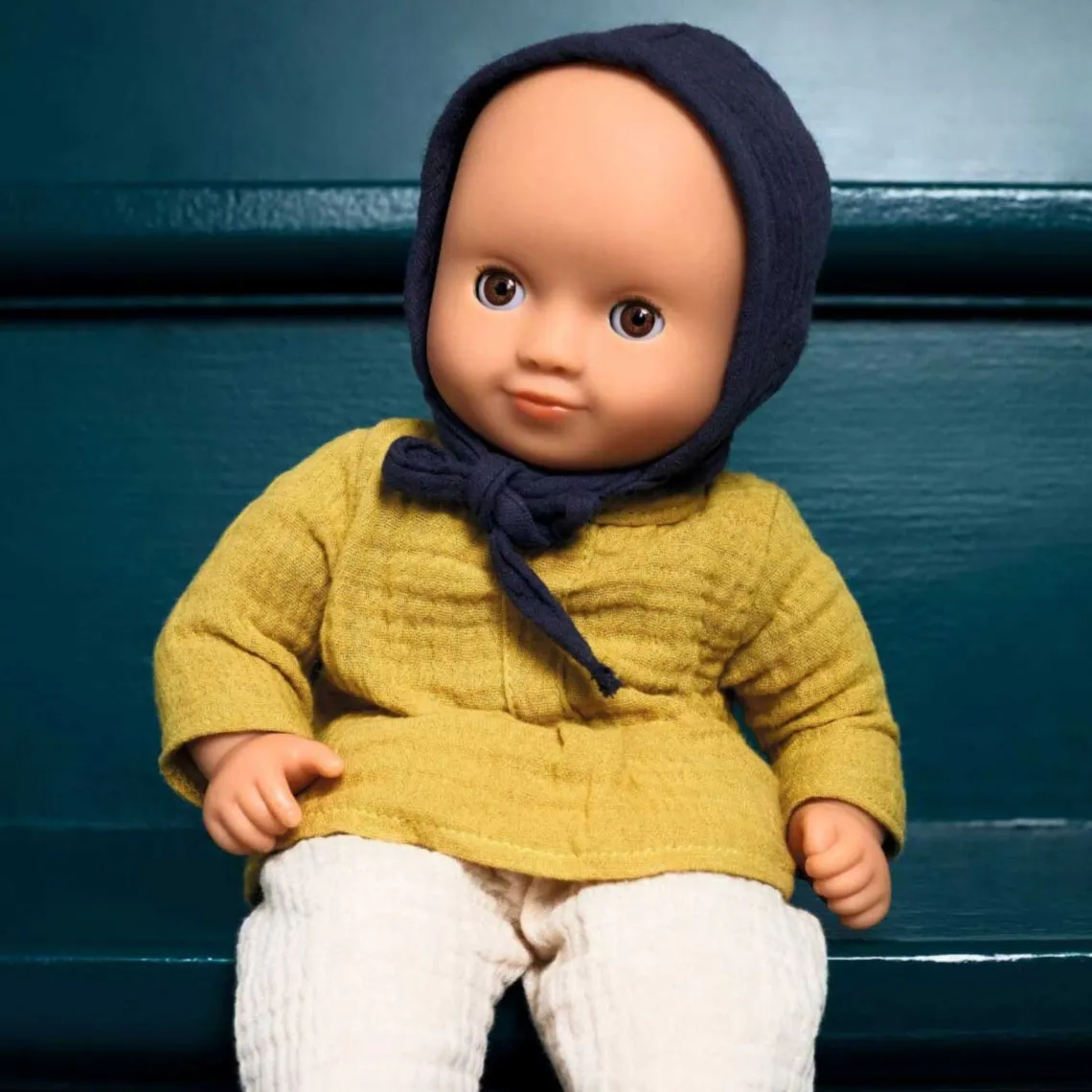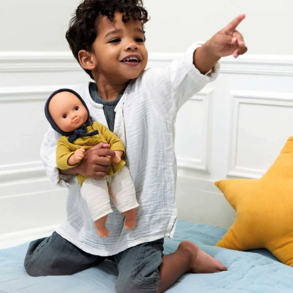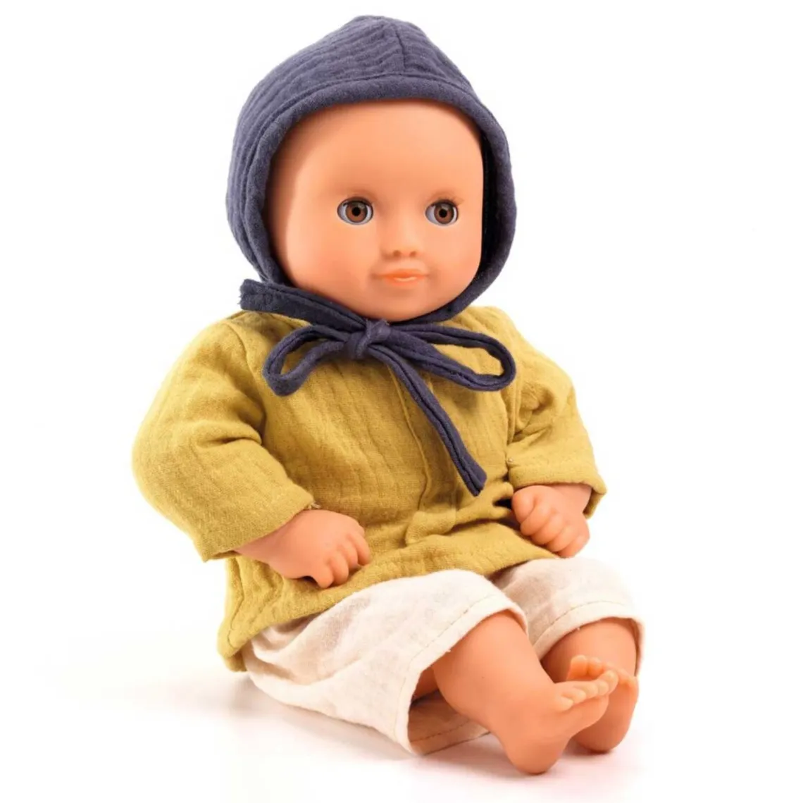 En skøn babydukke fra Djeco med en blød krop og det fineste tøj i muselin. Dukken har livagtige brune øjne, der kan lukkes, når hun lægges ned, hvilket gør legen endnu mere realistisk og hyggelig. Den bløde krop gør dukken nem at kramme og perfekt som barnets første dukke. Dukken kan maskinvaskes på skåneprogram i vaskepose, hvilket gør den nem at holde ren og frisk. Kroppens fyld er lavet af 100% genanvendelig fiber – et bæredygtigt valg for både barnet og miljøet. Materiale: 100% genanvendelig fiber (fyld), tøj i muselin