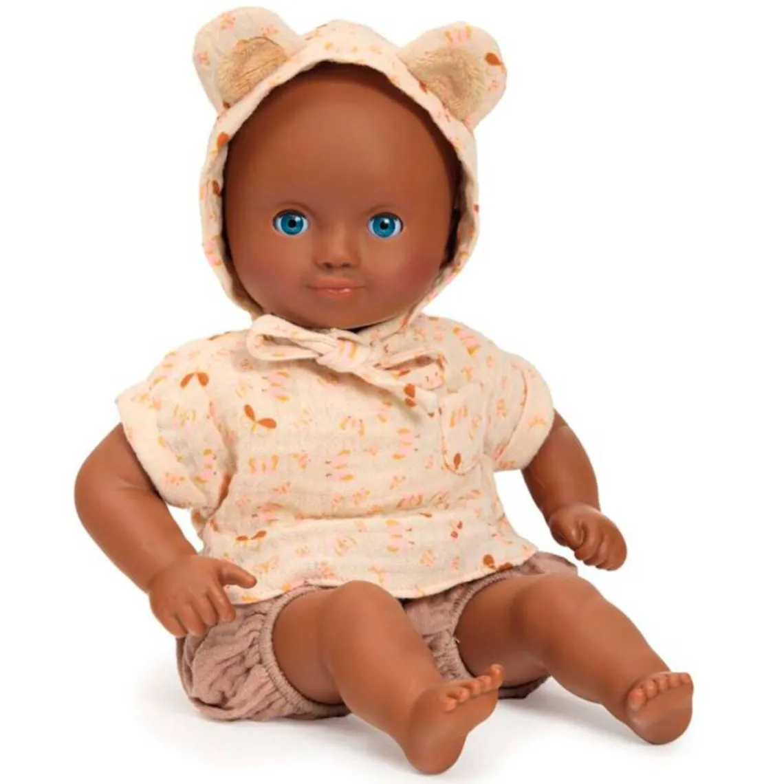 Baby Issoria er en skøn og charmerende dukke, der er velegnet til børn fra 18 måneder. Hun er let og har en perfekt størrelse på 32 cm, som gør hende nem at holde og kramme for små arme. Den bløde stofkrop er trykt med en fin bodystocking og gør det muligt at placere hende som en rigtig baby. Ansigt, arme og ben er fremstillet i blød vinyl med neutral duft, som føles behagelig at røre ved. Når hun lægges på ryggen, lukker hun øjnene og falder i søvn, hvilket gør legen ekstra livagtig. Dukken er iført bloomers, en kortærmet bluse og en smukt mønstret kyse med små bjørneører i dobbeltvævet bomuld. Tøjet har velcrolukning og elastik, så det er nemt for små hænder at tage af og på. Kroppen er fyldt med 100 % genanvendte fibre, og både dukke og tøj kan maskinvaskes ved 30 °C. Sættet indeholder én dukke samt bloomers, bluse og kyse.