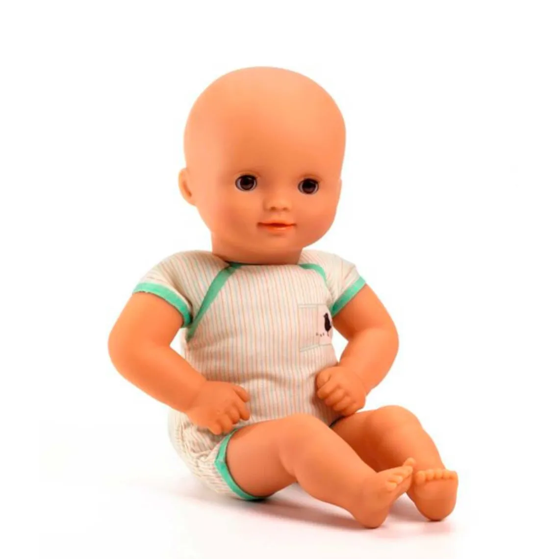 Med sine store brune øjne og engleagtige ansigt er Baby Jacinthe en skøn og livagtig dukke, der passer til børn fra 18 måneder. Hun er let og har en ideel størrelse på 32 cm, som gør hende nem at holde og kramme for små arme. Den bløde stofkrop er trykt med en fin bodystocking og gør det muligt at placere hende som en rigtig baby. Ansigt, arme og ben er fremstillet i blød vinyl med neutral duft, som er behagelig at røre ved. Når hun lægges på ryggen, lukker hun øjnene og falder i søvn, hvilket gør legen ekstra realistisk. Hovedet kan drejes til venstre og højre, så hun let kan positioneres i legen. Dukken er iført en fin sparkedragt og en smuk kyse i dobbeltvævet bomuld, og tøjet har velcrolukning bagpå, så det er nemt at tage af og på. Kroppen er fyldt med 100 % genanvendte fibre. Sættet indeholder én dukke på 32 cm med blød stofkrop samt vinylhoved, arme og ben, én sparkedragt og én kyse.
