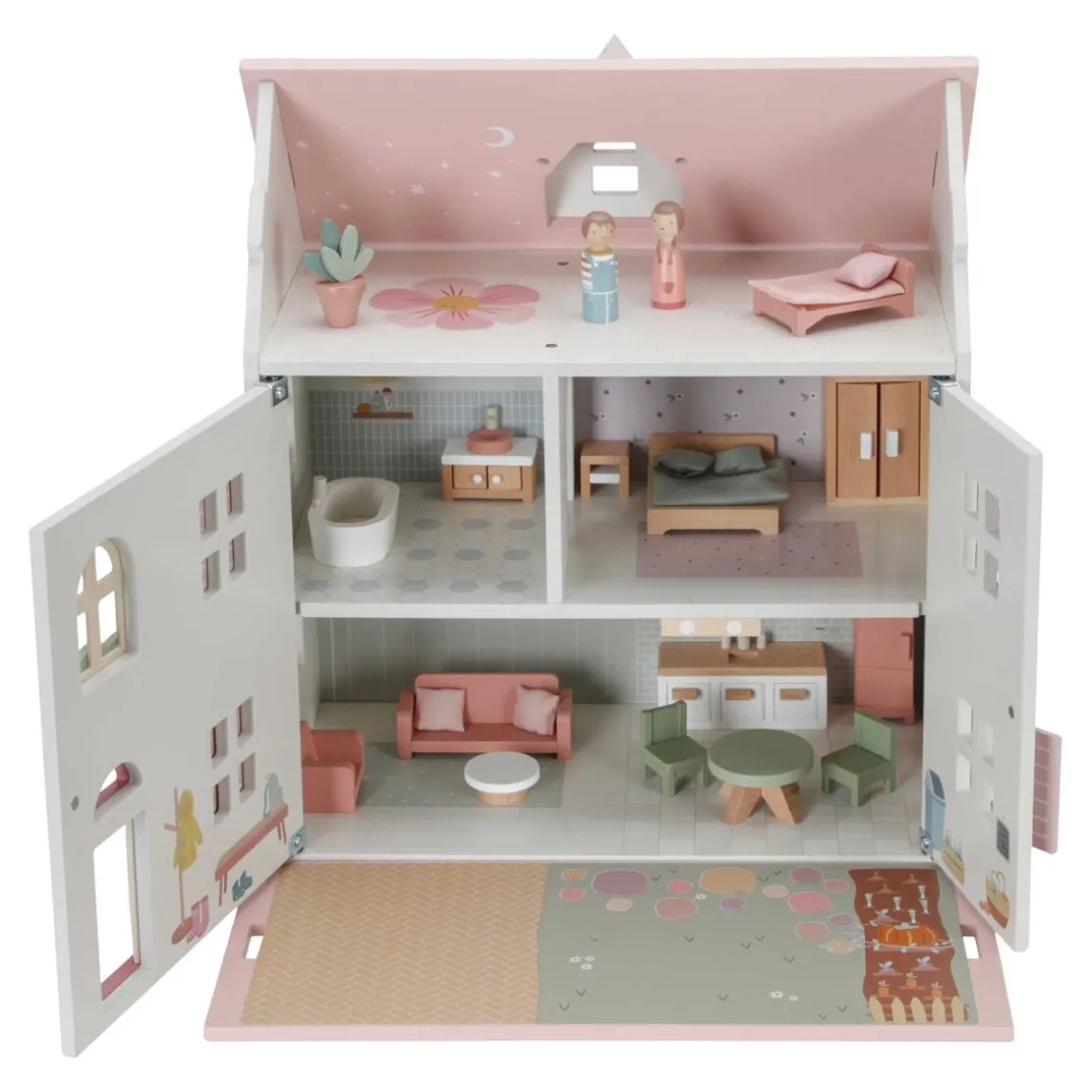 Trædukkehuset fra Little Dutch er det perfekte sted for børn at slippe fantasien løs. Det smukke hus er hvidt med lyserødt tag og træskodder, der kan åbnes og lukkes. Taget kan åbnes for ekstra legesjov, og en del af taget kan omdannes til en lille have. Indvendigt er huset detaljeret dekoreret med smukke illustrationer og indeholder en stue, et køkken, et badeværelse, et soveværelse samt et børneværelse – alle møbleret med matchende tilbehør. Med de to dukker Jim og Rosa kan legen begynde med det samme. Dukkehuset giver timevis af kreativ leg og kan udvides med ekstra tilbehørssæt for endnu mere sjov. En skøn gave, der inspirerer til rolleleg, fantasi og samvær. Produktmål: 22,5 × 42,8 × 48,8 cm