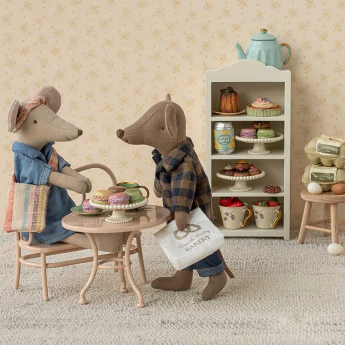 Far mus i lysebrunt stof. Han er iført en ternet t-shirt, tank top og denim bukser. Denne mus passer til møbler og tilbehør i størrelse mus. Køb mere tøj separat. Tøj i størrelse mor/far passer til denne mus.