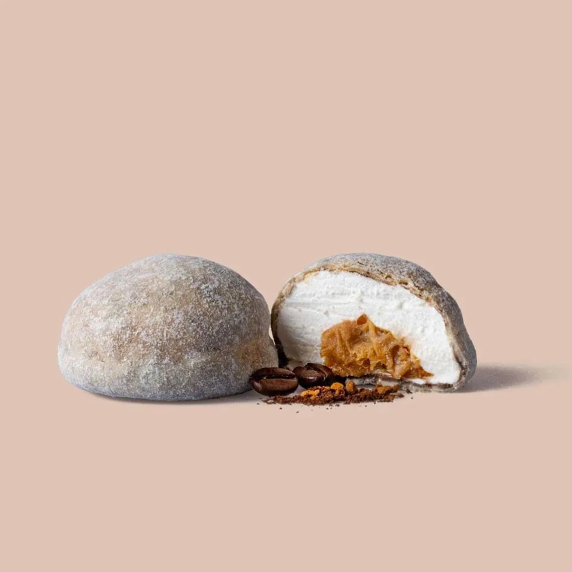 Karamelfyldte skumfiduser dragéret med belgisk hvid chokolade og karamel.