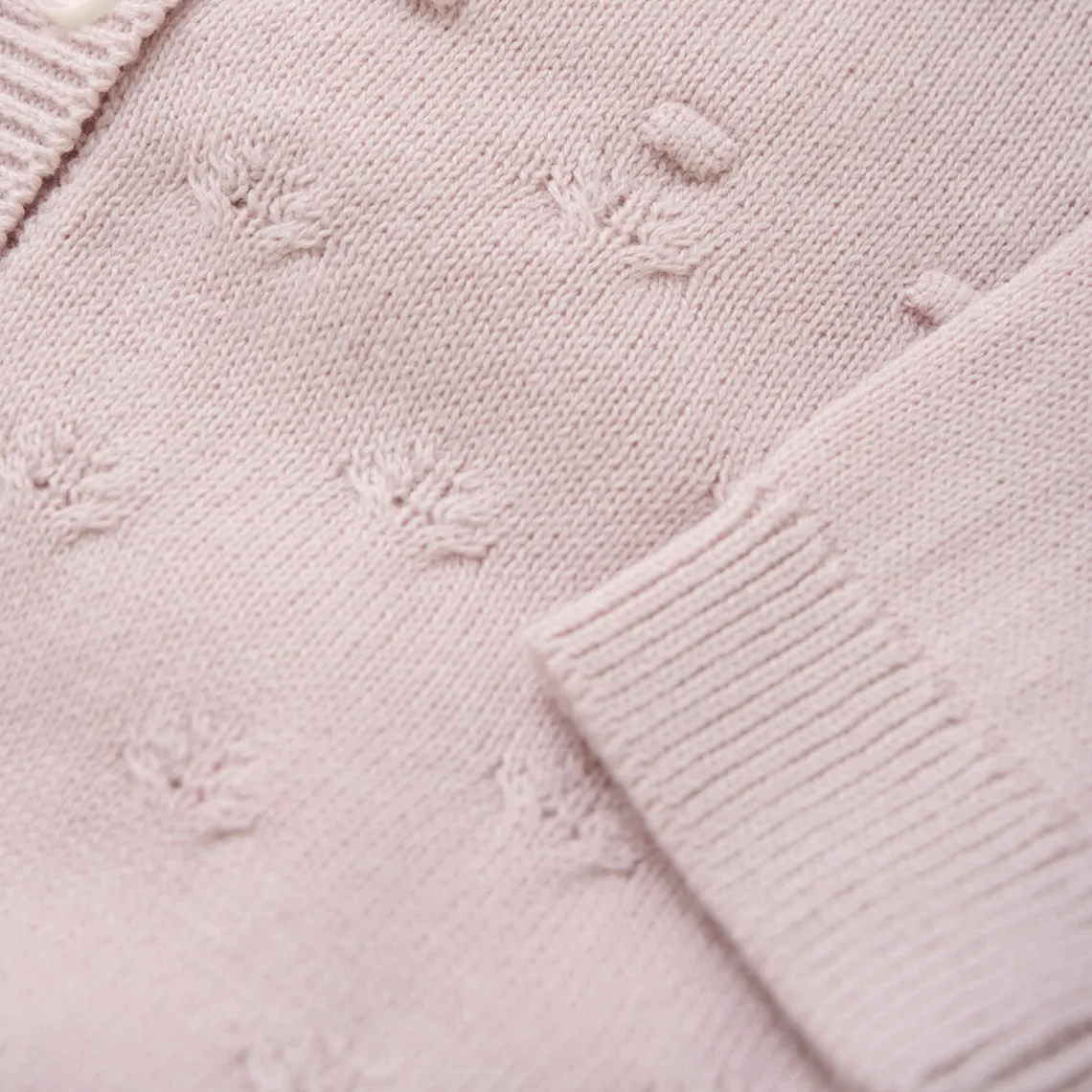 Cardiganen lukkes med knapper foran, og har det smukkeste strik mønster.