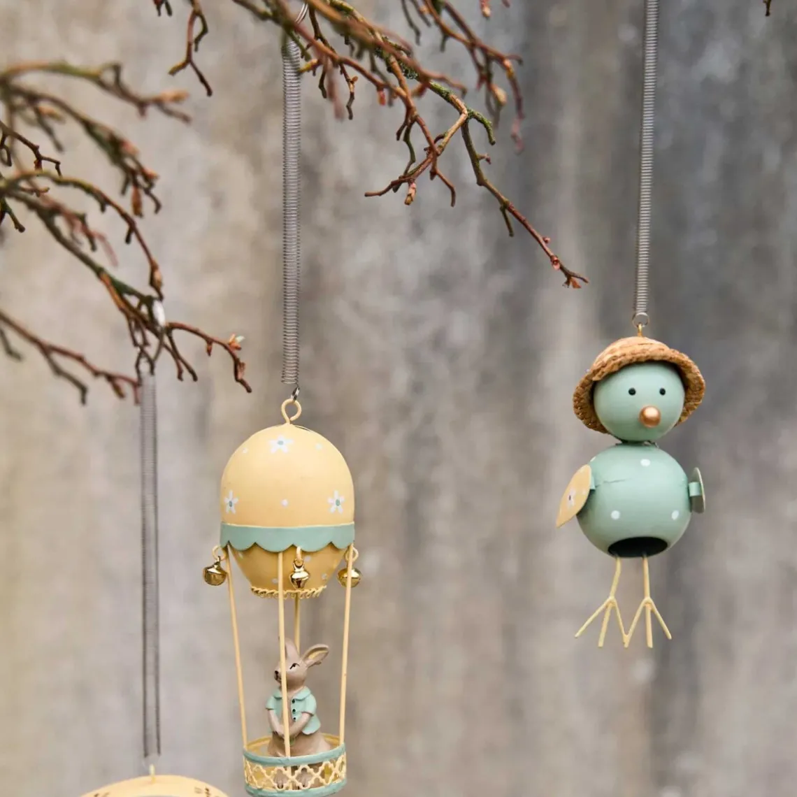 Fugl med stråhat i metal med fjederophæng. Sjov og hyggelig påskedekoration.