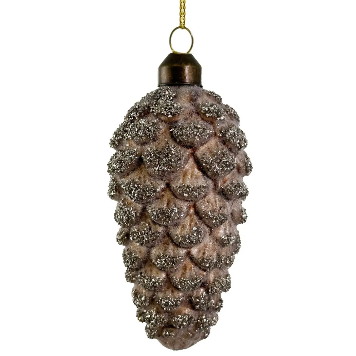 En elegant glasjulekugle i ca. 11 cm højde, med en varm “sugared brown” nuance og fine detaljer i sølvglitter skabt til at tilføre stilfuld glans og vinterhygge til juletræet eller dekorationen.