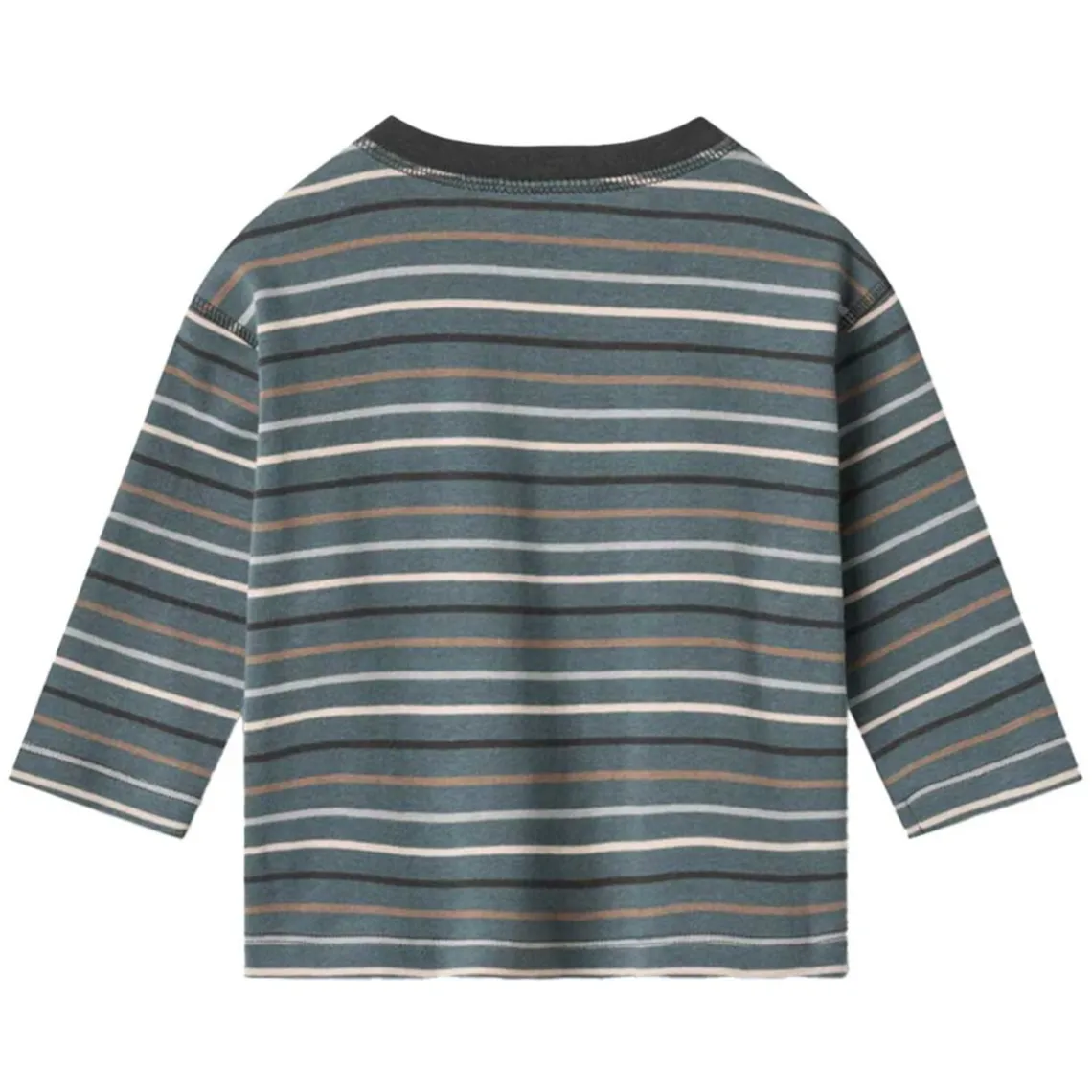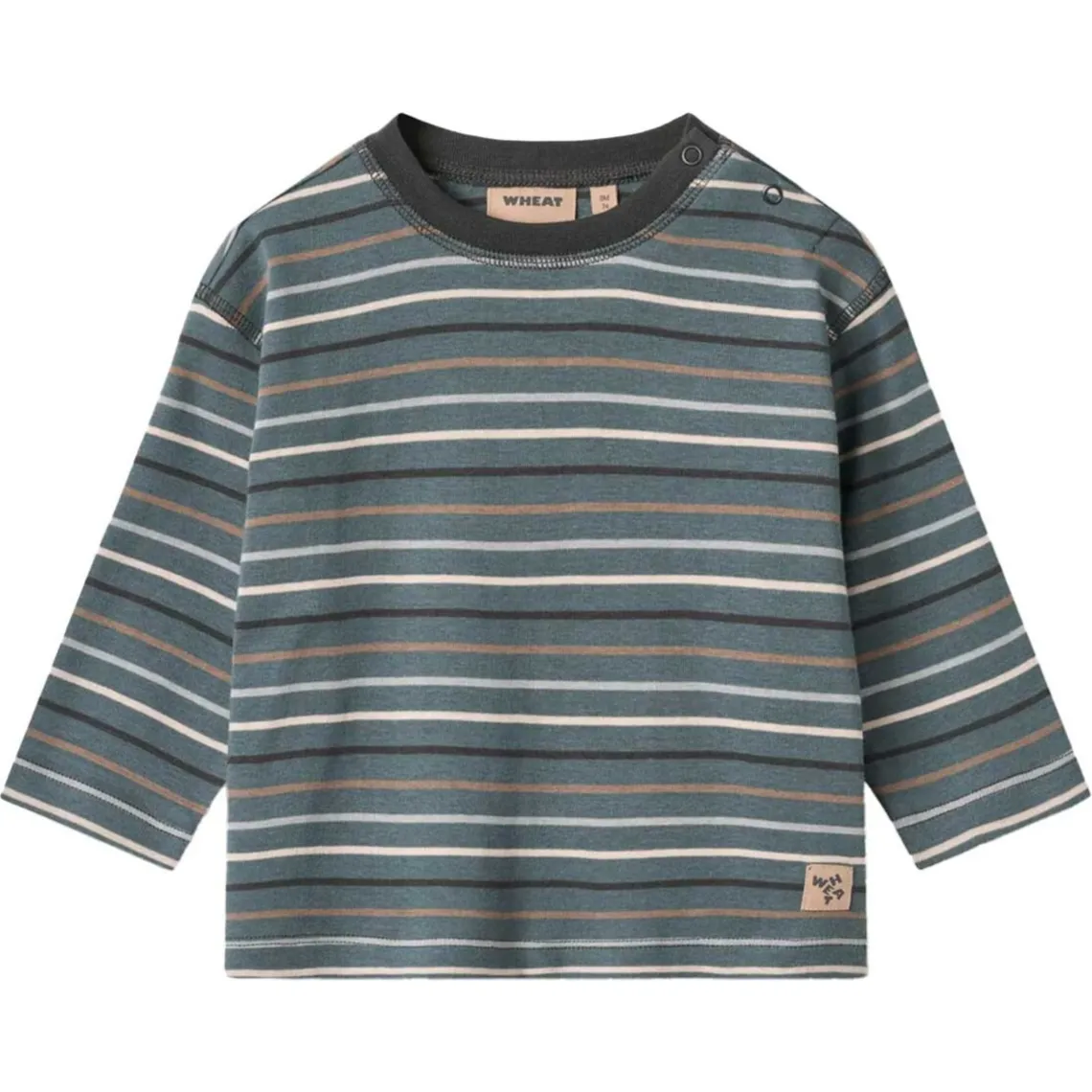 Langærmet stribet T-shirt fra Wheat i blødt økologisk bomuld. T-shirten har løs pasform, lav skuldersøm og trykknapper på venstre skulder for ekstra komfort. De karakteristiske Wheat-signaturstriber giver et tidløst udtryk. En klassisk basisdel, der er nem at style med bukser og en strik alt efter vejr og anledning. Materiale: 100% økologisk bomuld