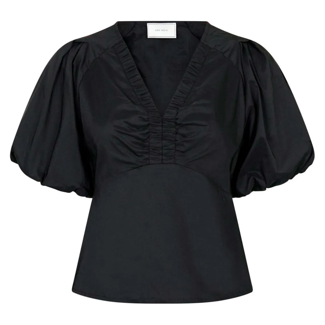 Elegant sort bluse i let poplin-kvalitet med en ren og moderne silhuet. Blusen har en V-udskæring og let rynkedetalje, der fremhæver silhuetten. Perfekt til både hverdag og mere formelle looks, og nem at style alene eller med lag-på-lag.