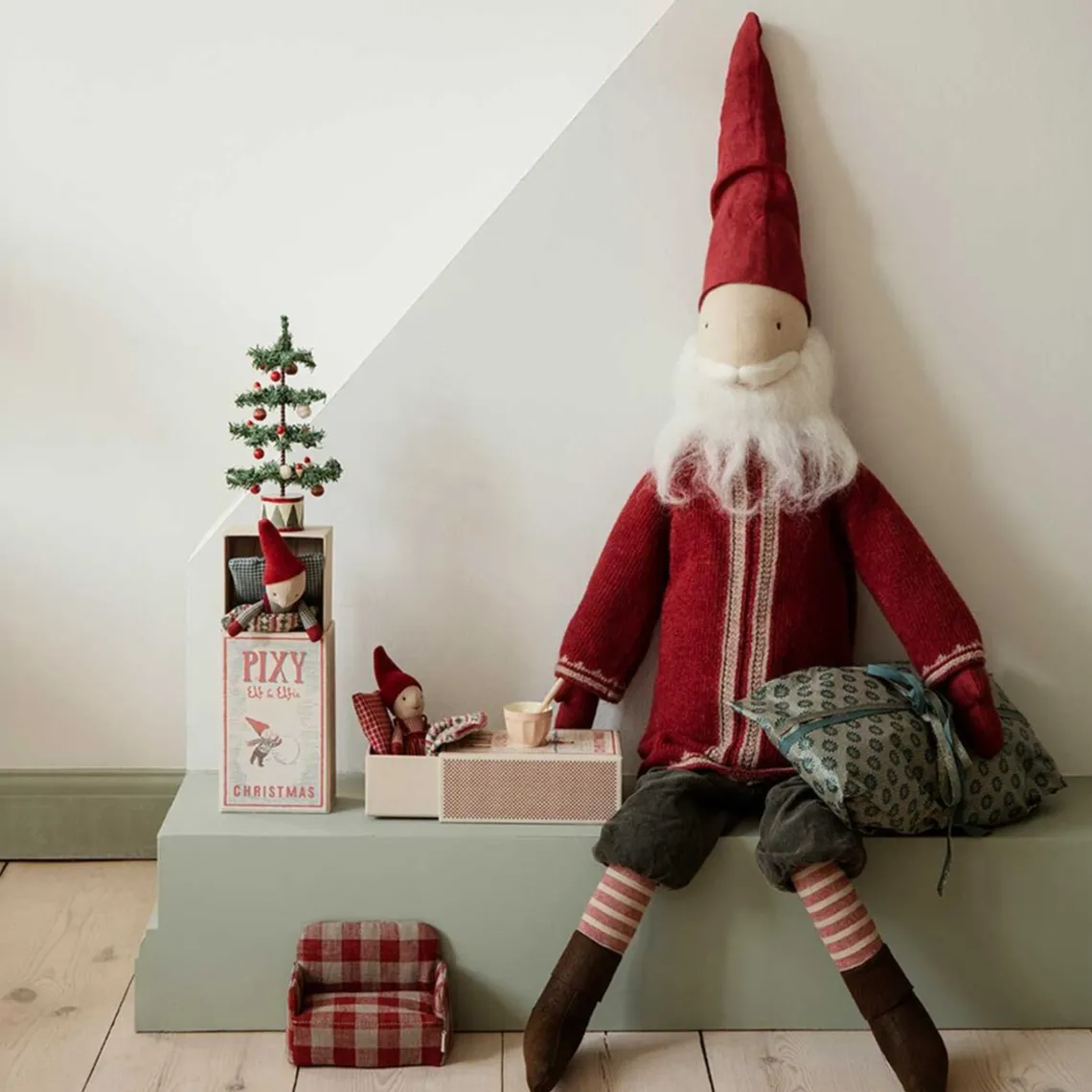 Denne charmerende lille julemand er klædt i en blød lammeuldstrøje og afslappede bukser. Sammen med sin kone skaber han en hyggelig julestemning og er et uundværligt dekorativt element i ethvert hjem. Mål: