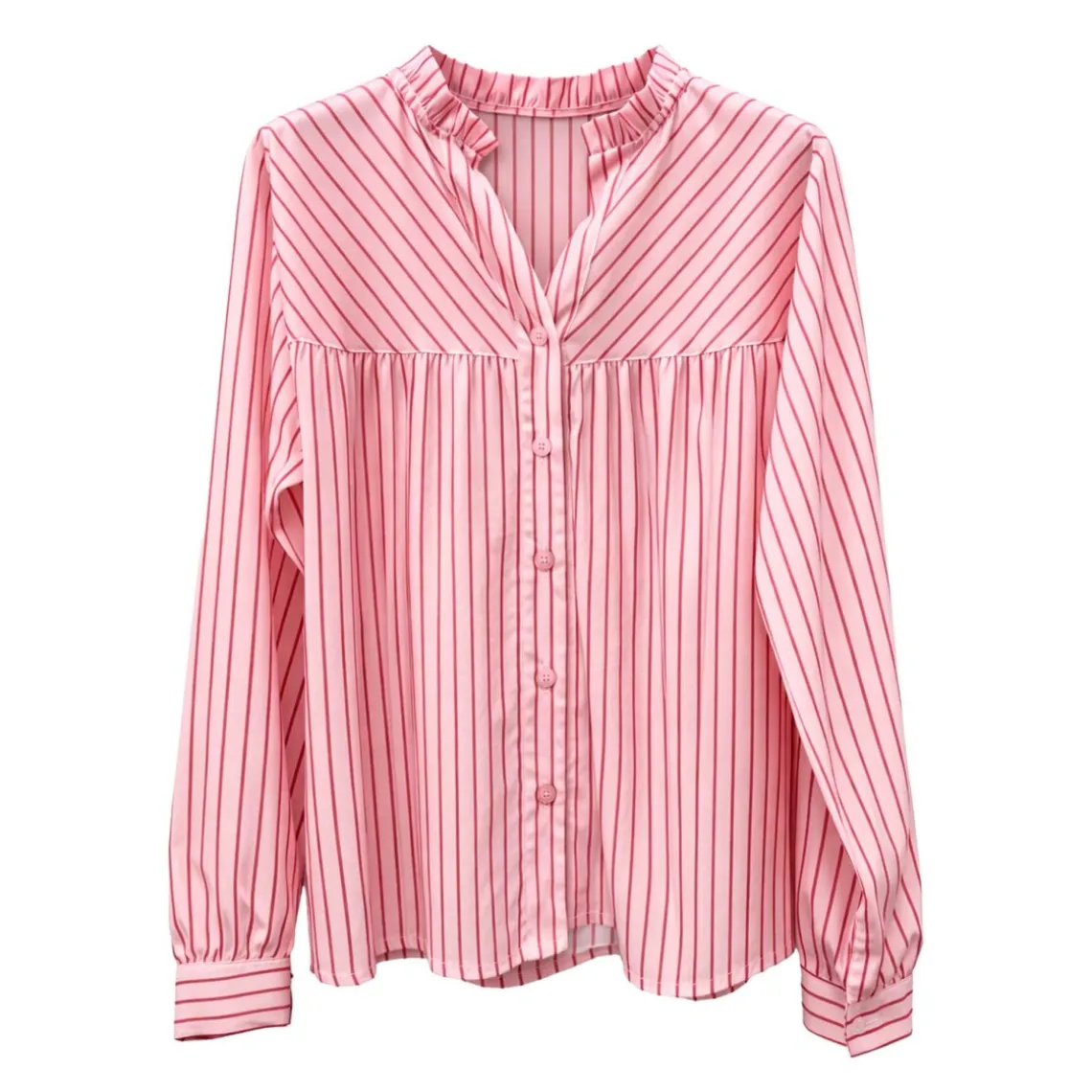 Feminin og let bluse fra Marta Du Chateau i en smuk rosa nuance med fine, vertikale striber. Blusen har lange ærmer, en elegant v‑udskæring med lille flæsekant ved halsen samt let rynkning over brystet, som giver et blødt, romantisk og flatterende udtryk. Materiale: 97% bomuld, 3% elastan