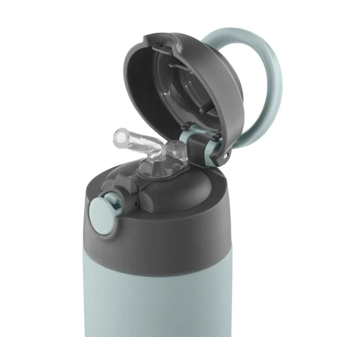 Drikkeflasken har et unikt låg der åbnes med et let tryk på knappen. I låget sidder et blødt sugerør, som er skånsomt for deres små tænder.