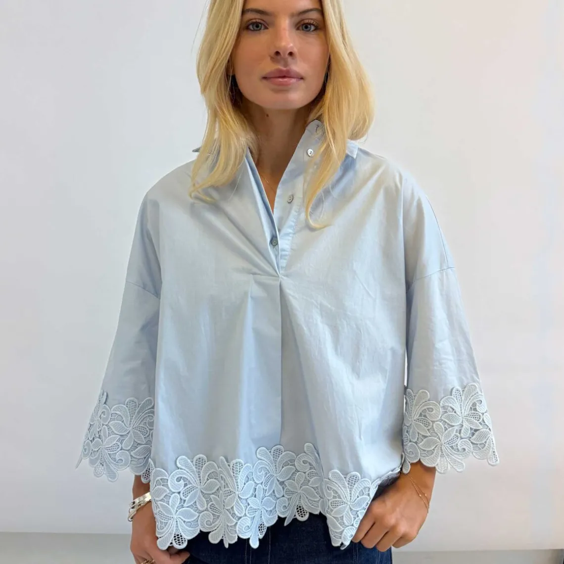 Lyseblå bluse med delikate broderidetaljer og let, luftig kvalitet. Løst snit med feminine ærmer skaber et elegant, sofistikeret look – perfekt til både hverdag og mere formelle lejligheder.