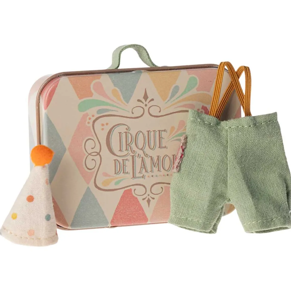 Sættet inkluderer bukser og hat – alt sammen pakket i en lille metalkuffert, så det er nemt at tage med.