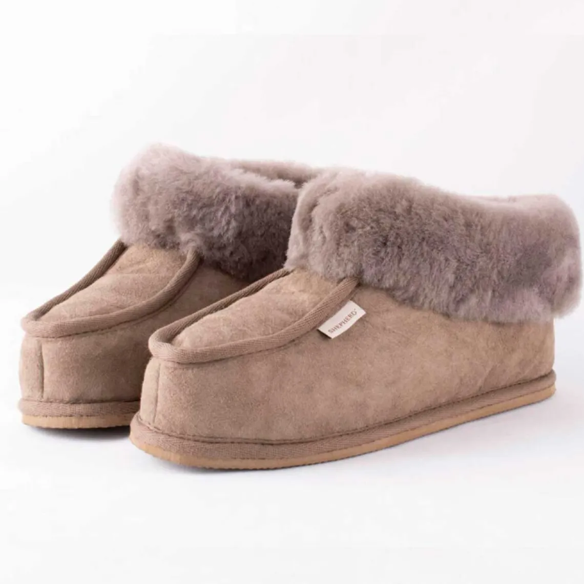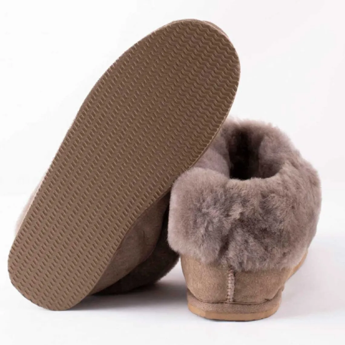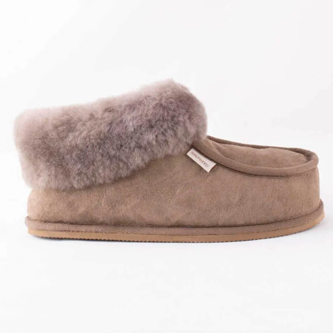 Hjemmeskoene er udformet i en ankelmodel med en bred foldet kant i fåreskind og et dekorativt kantbånd i tekstil foran og rundt ved sålen. Ydersål i EVA. Forklaring af sålens materiale