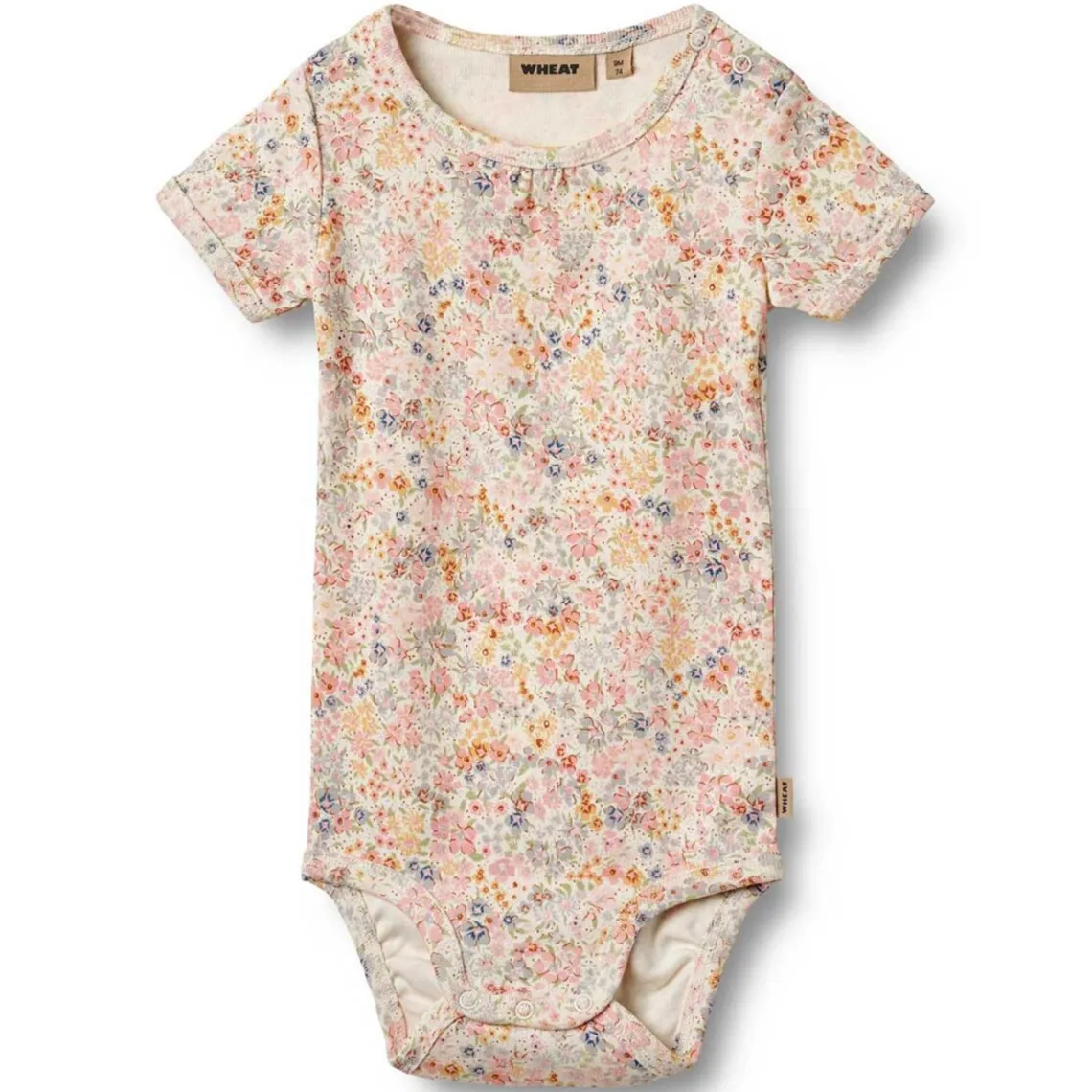 Linette bodystocking fra Wheat. Her får du en skøn kortærmet bodystocking, som kommer i et smukt print. Denne bodystocking har en tæt pasform, små læg på halsudskæringen, trykknapper på den ene skulder og trykknapper mellem benene.