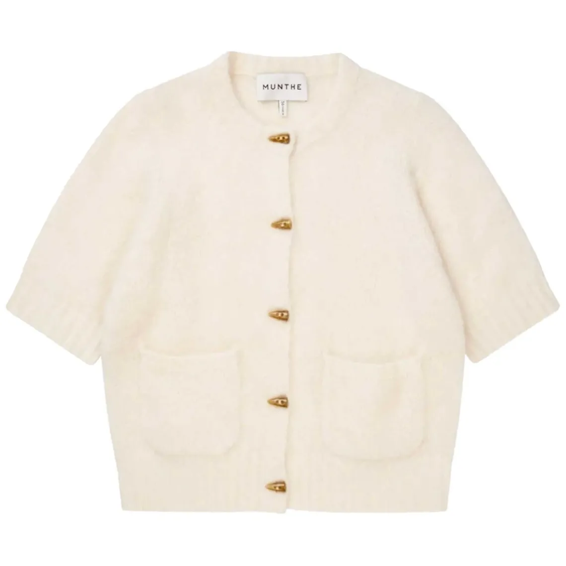 Cardigan med korte ærmer, imiterede hornknapper og to lommer foran. Den er designet med en blød, børstet overflade med et eksklusivt udtryk og høj andel af alpaca, som giver både varme og lethed. Materiale: 55% alpaca, 24% akryl, 19% polyamid, 2% elastan