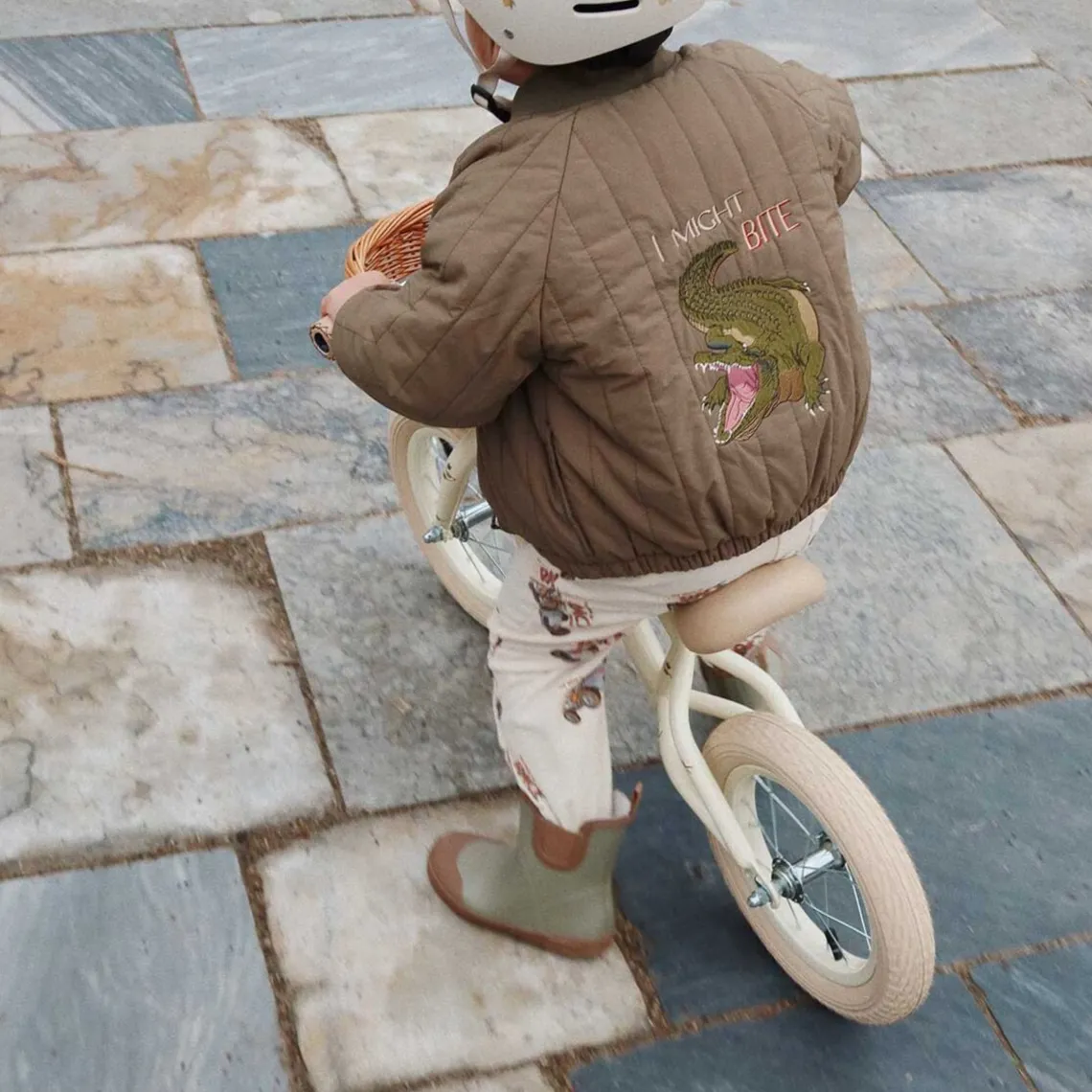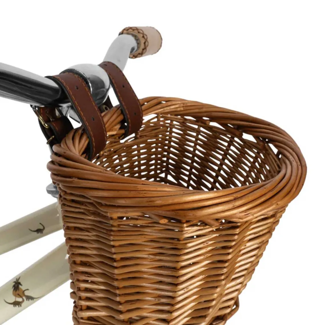 Et let design med en robust stålramme, der er let at køre på og let at bære, når de små fødder bliver trætte. Materiale: stel og klokke i stål, styr og sæde i kunstlæder, hjul af gummi, kurv i flet H: 63 cm x B: 44 cm x L: 86 cm