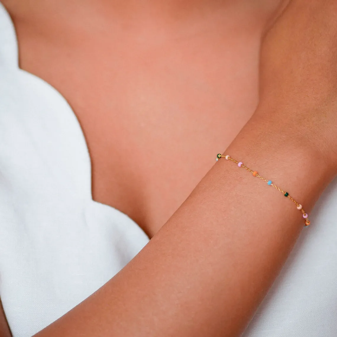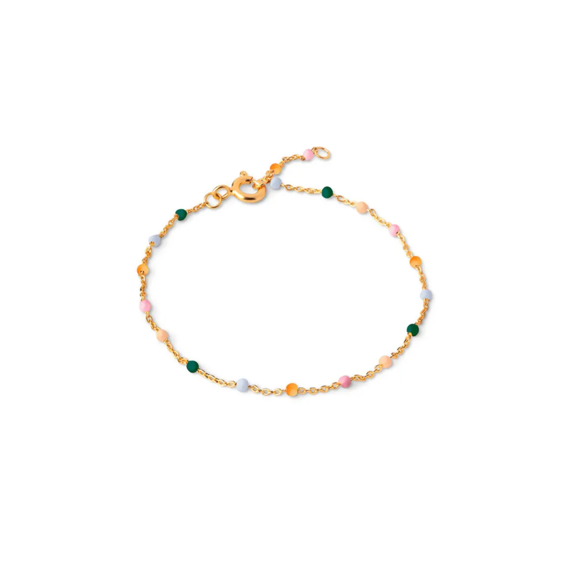 Lola armbåndet fra Enamel er en fin kæde med små emaljer i smukke farver. Armbåndet giver en fin farverig detalje og kan perfekt kombineres med flere armbånd.