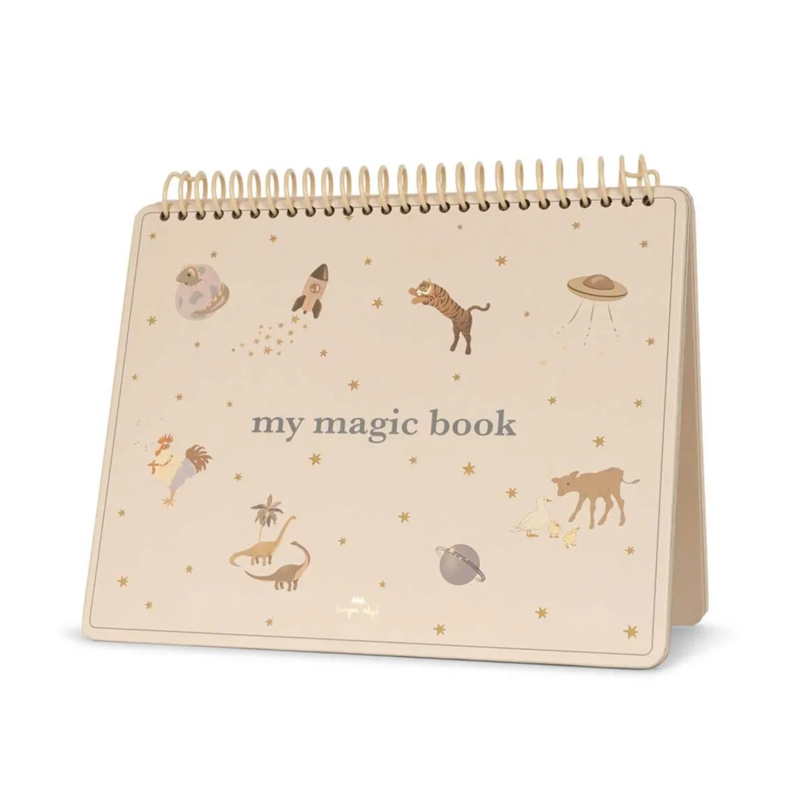 De genanvendelige sider er hvide med enkle stregtegninger af dyr i tør form, og der dukker farver op, når papirert bliver vådt.