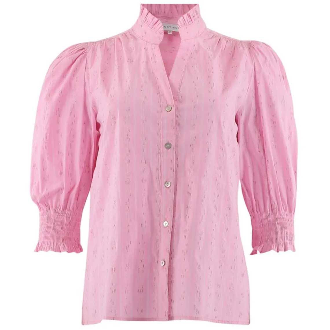 Smuk pink bluse fra Continue med 3/4 lange ærmer, der giver et friskt og feminint touch til din sommergarderobe. Blusen er let og behagelig med en flatterende pasform, perfekt til både hverdag og festlige lejligheder. Et musthave, der løfter ethvert sommeroutfit med sit klare farvevalg og tidløse design. Materiale: 65% bomuld, 33% polyester, 2% elastan