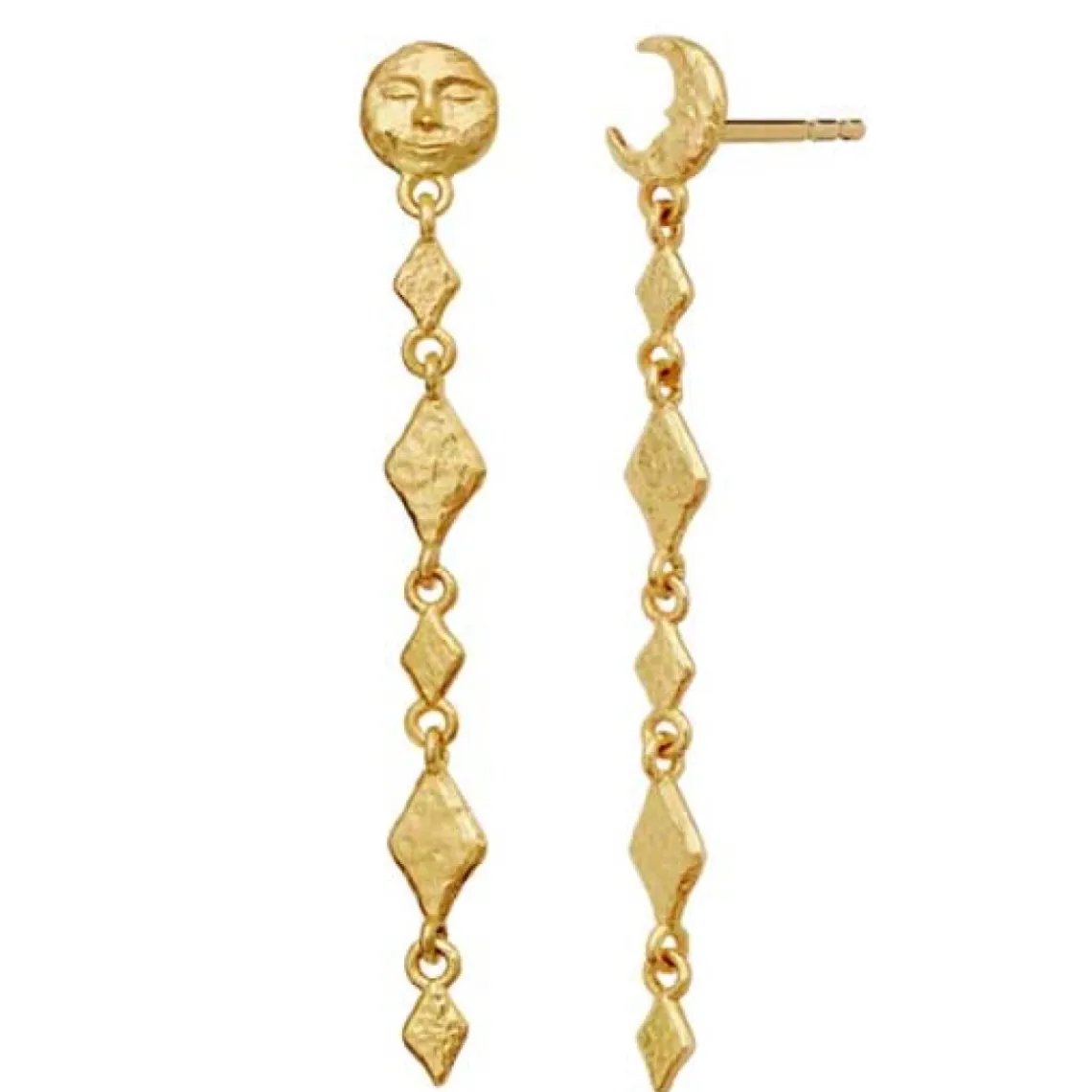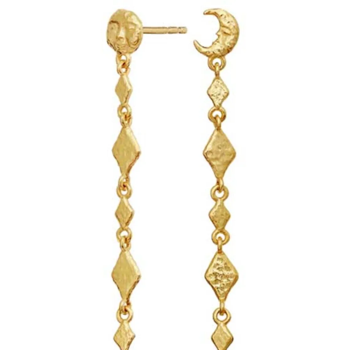 Minola Øreringe er inspireret af månens skiftende faser og symboliserer kreativitetens evigt foranderlige væsen. De elegante kæder med små harlekinformer skaber et yndefuldt og feminint udtryk, der bevæger sig let med dit ansigt og tilføjer et sofistikeret, luksuriøst touch til ethvert look. Den 18K guldbelagte overflade fremhæver smykkets detaljer og giver et tidløst, elegant udtryk, som passer til både hverdag og særlige lejligheder. Materiale: Genanvendt sterling sølv (925) belagt med 18K guld