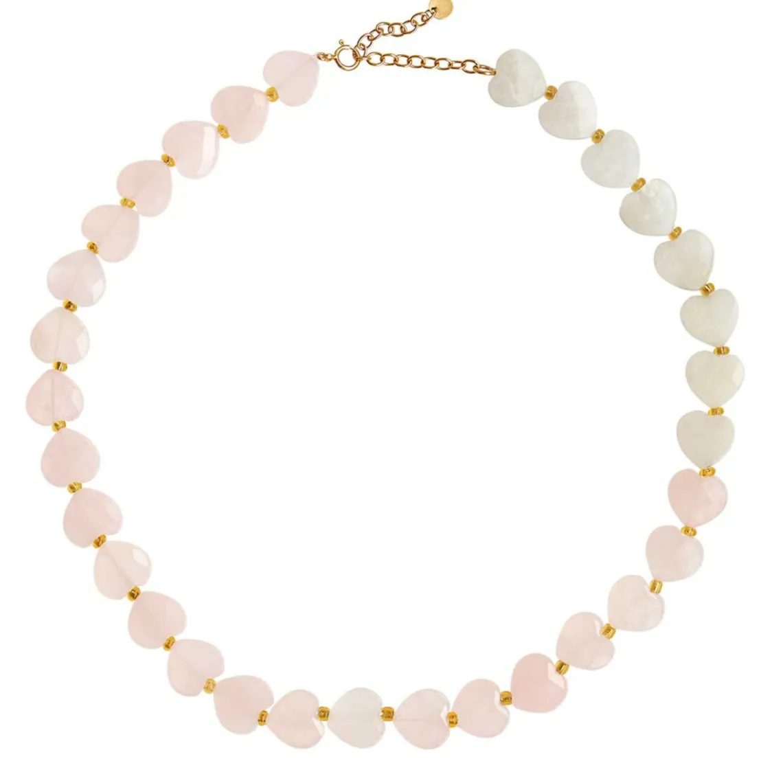 Romantisk halskæde med rosakvarts og rainbow moonstone hjerter. Denne smukke halskæde forener 22 hjerter af rosakvarts og 8 hjerter af rainbow moonstone i et magisk og harmonisk design. Rosakvarts, kendt som kærlighedens sten, kombineres med rainbow moonstone, der symboliserer lys og balance. De blide farver i denne unikke sammensætning gør halskæden til den perfekte accessory – både som et elegant touch til hverdagen og som et iøjnefaldende element til særlige begivenheder.