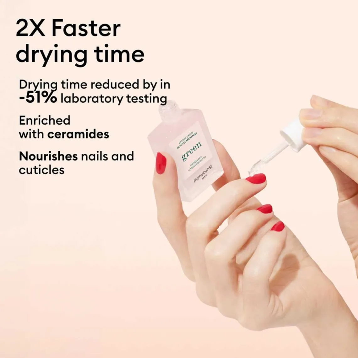 Tørredråber, der halverer tørretiden for Green™-nagellak, og efterlader dine negle perfekt næret. Fyldt med ceramider giver de intensiv pleje til både neglen og dens kontur. Med en praktisk trykknap er påføringen både nem og ultrapræcis. Én dråbe pr. negl er alt, hvad du behøver, for at afslutte din manicure på en perfekt og effektiv måde.