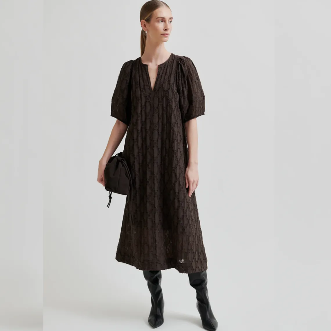 Second Female kortærmet kjole med burnout. Kjolen er fremstillet i en viskoseblanding med struktureret mønster med semitransparent burnout-effekt. Med V-udskæring og firkantede skuldersømme med korte pufærmer. Aftagelig underkjole med justerbare stropper.