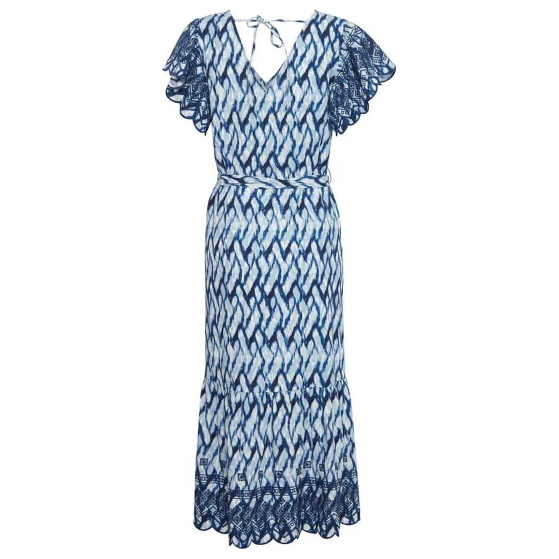 Nellio kjole fra Atelier Reve. Her får du en smuk kjole, som kommer i det fineste blå print. Denne kjole er med korte ærmer, med bindbånd i taljen, den bindes i nakken og den er med en v-udskæring både foran og bagpå.