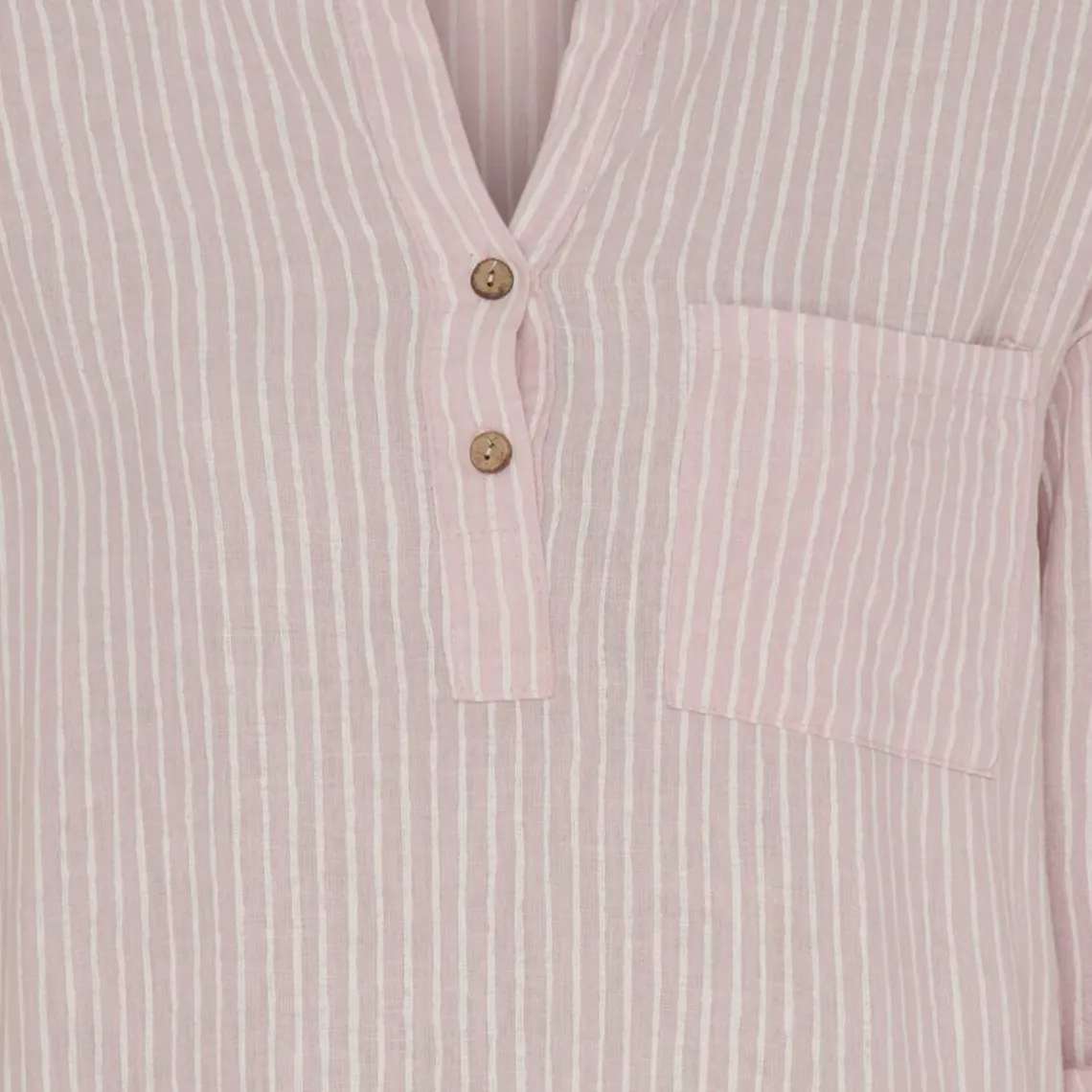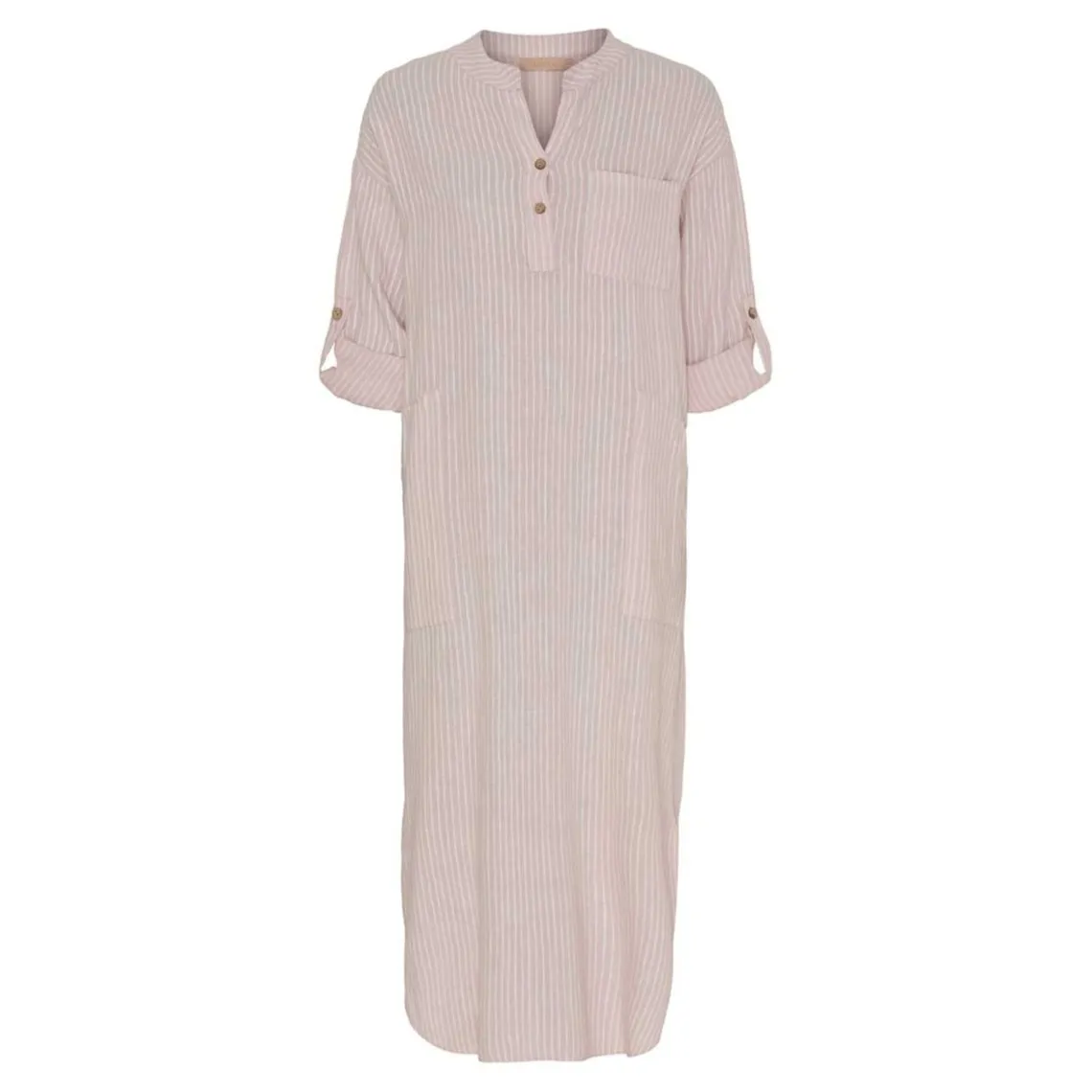Farven er en lys rosa med hvid stribeeffekt – et mildt, varmt og behageligt farvespil, der giver kjolen et blødt og feminint udtryk.