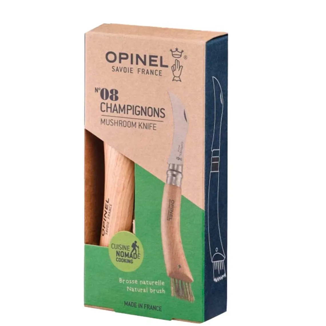 En klassisk foldekniv fra Opinel, designet specifikt til svampeplukning. Det krumme blad i rustfrit stål gør det nemt at skære svampene ved roden, mens den rillet bagkant og integrerede børste i skæftet giver mulighed for effektiv rengøring af jord og nåle. Kniven er udstyret med Virobloc® låsering for sikkerhed. Skaftet er lavet af lakeret eg, og kniven leveres ofte i gaveæske med læderskede, klar til tur i skovbunden. Kniven er ca. 20 cm lang inkl. børster.