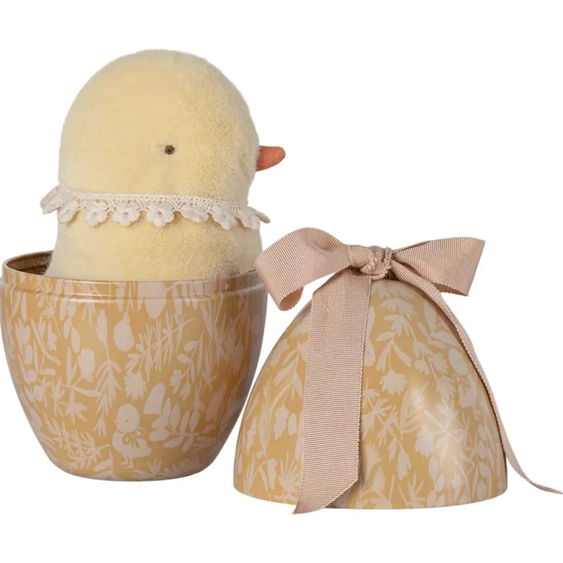 En sød blød plyskylling med bomuldskrave i vintage stil, kommer i det skønneste metalæg med smukt print og en stor sløjfe på toppen – en perfekt gave til de små.