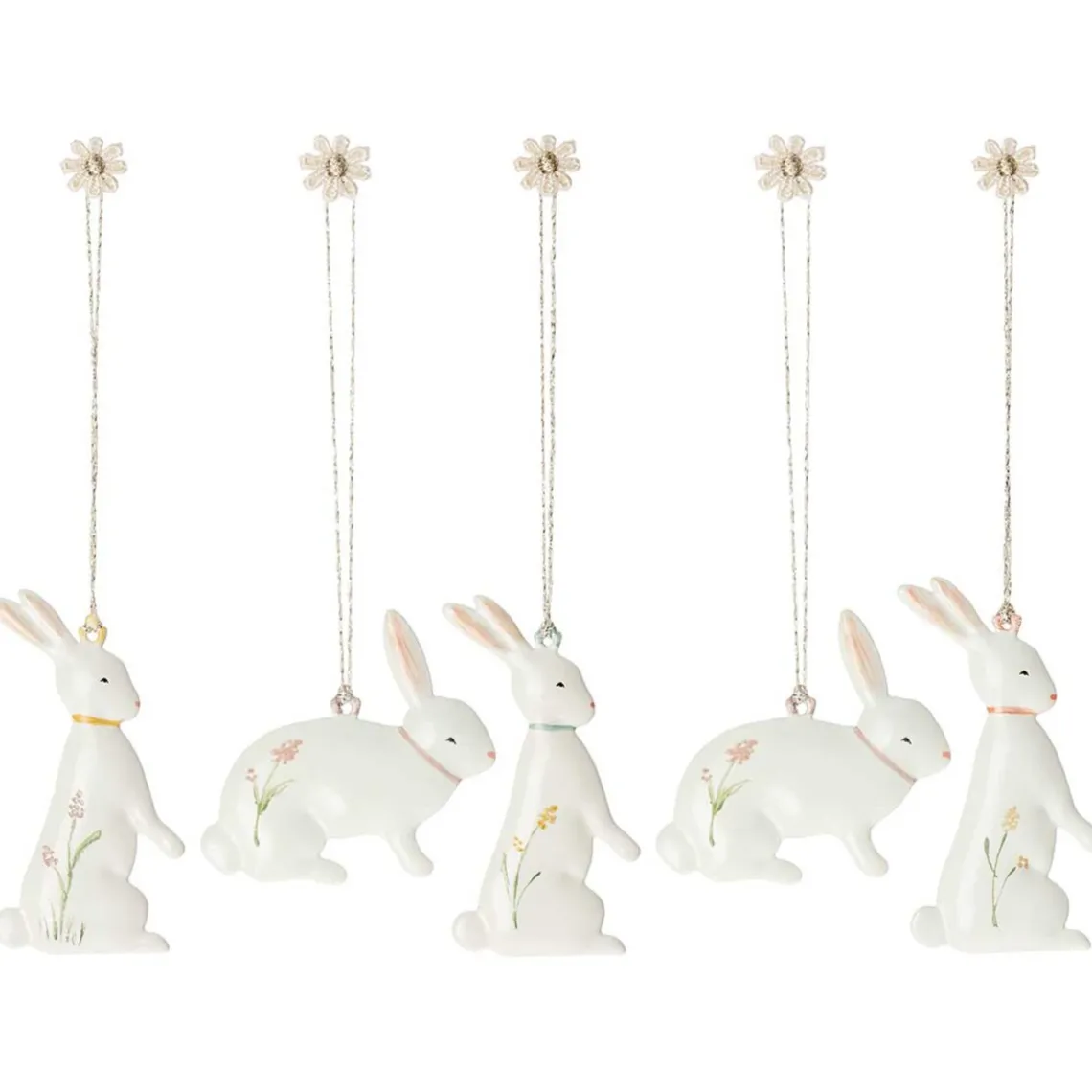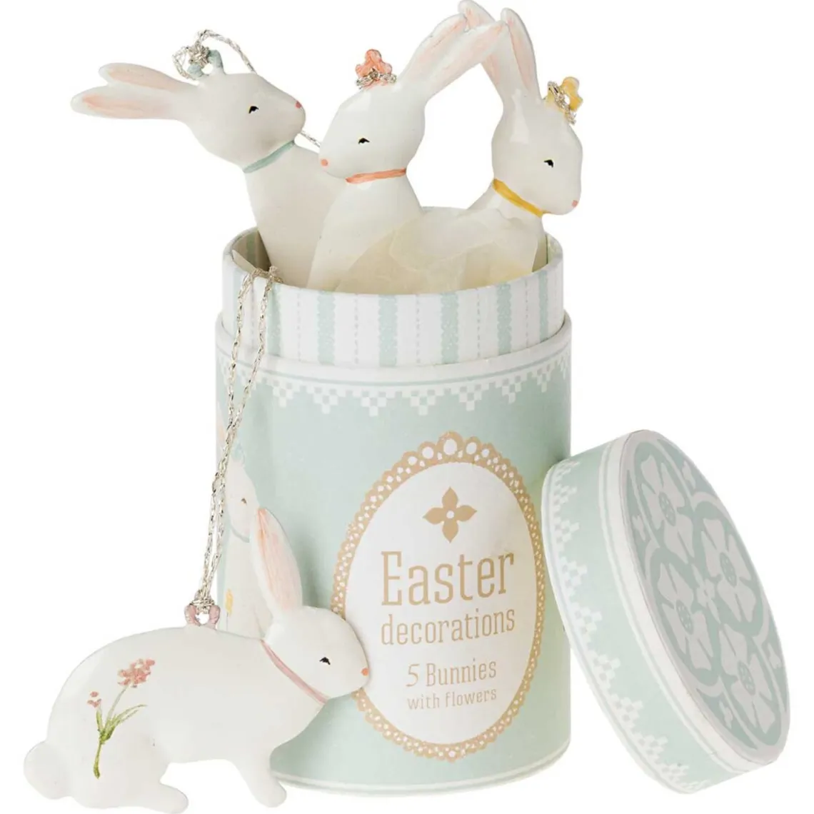 Påskepynt fra Maileg. Dette er en super smuk æske som indeholder 5 søde påskeharer. Du kan sætte et par grene i en vase og hænge de smukke ophæng på grenene. Du kan kombineres dem med andre flotte ornamenter. Der medfølger 5 stk. påskeharer i denne flotte æske.
