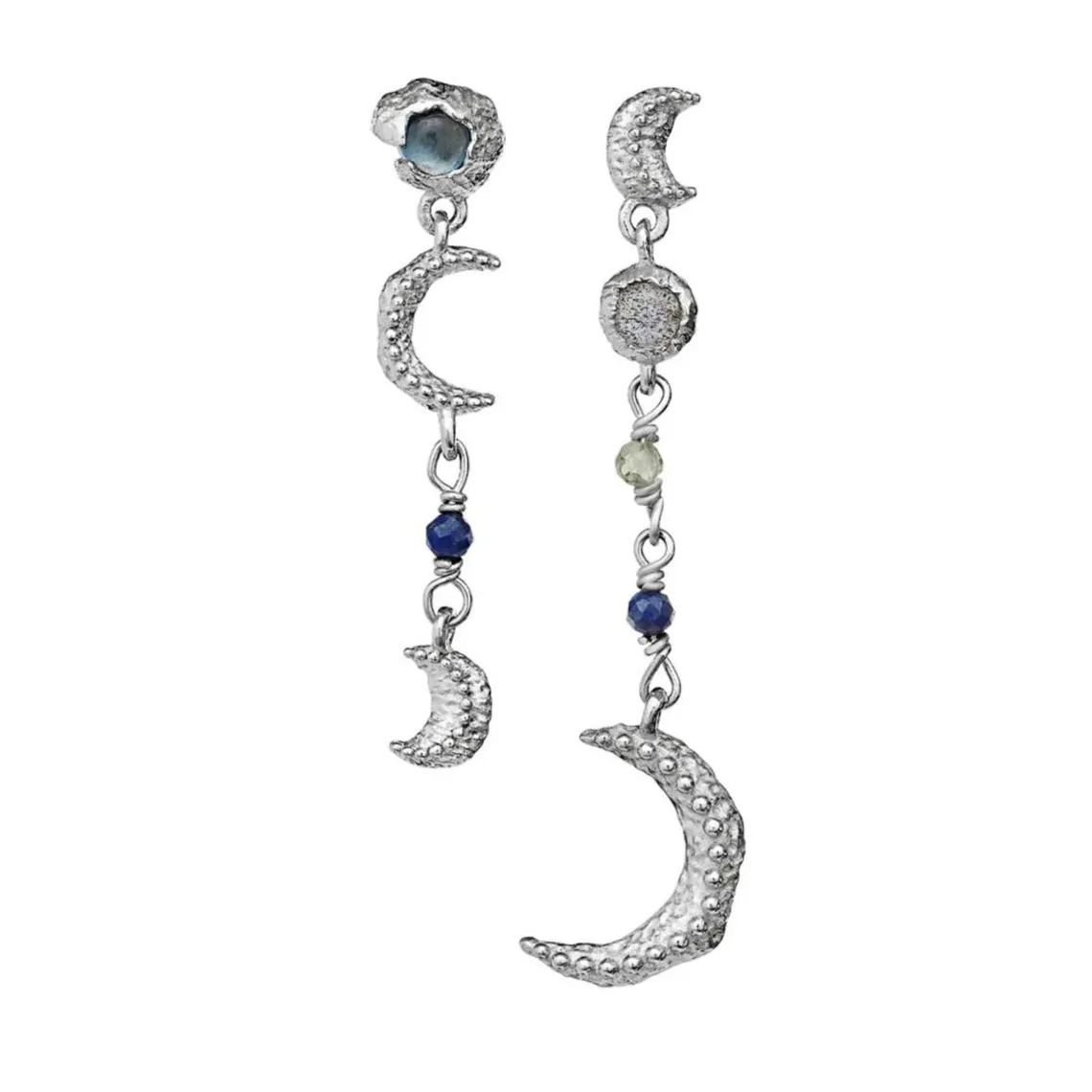 De to øreringe er forskellige i deres udformning: den ene har en lille måne øverst efterfulgt af en guldindrammet sten, to små krystaller og en måne nederst. Den anden har en guldindrammet sten øverst efterfulgt af en måne, en lille krystal og en lille måne nederst.