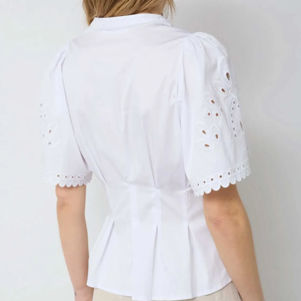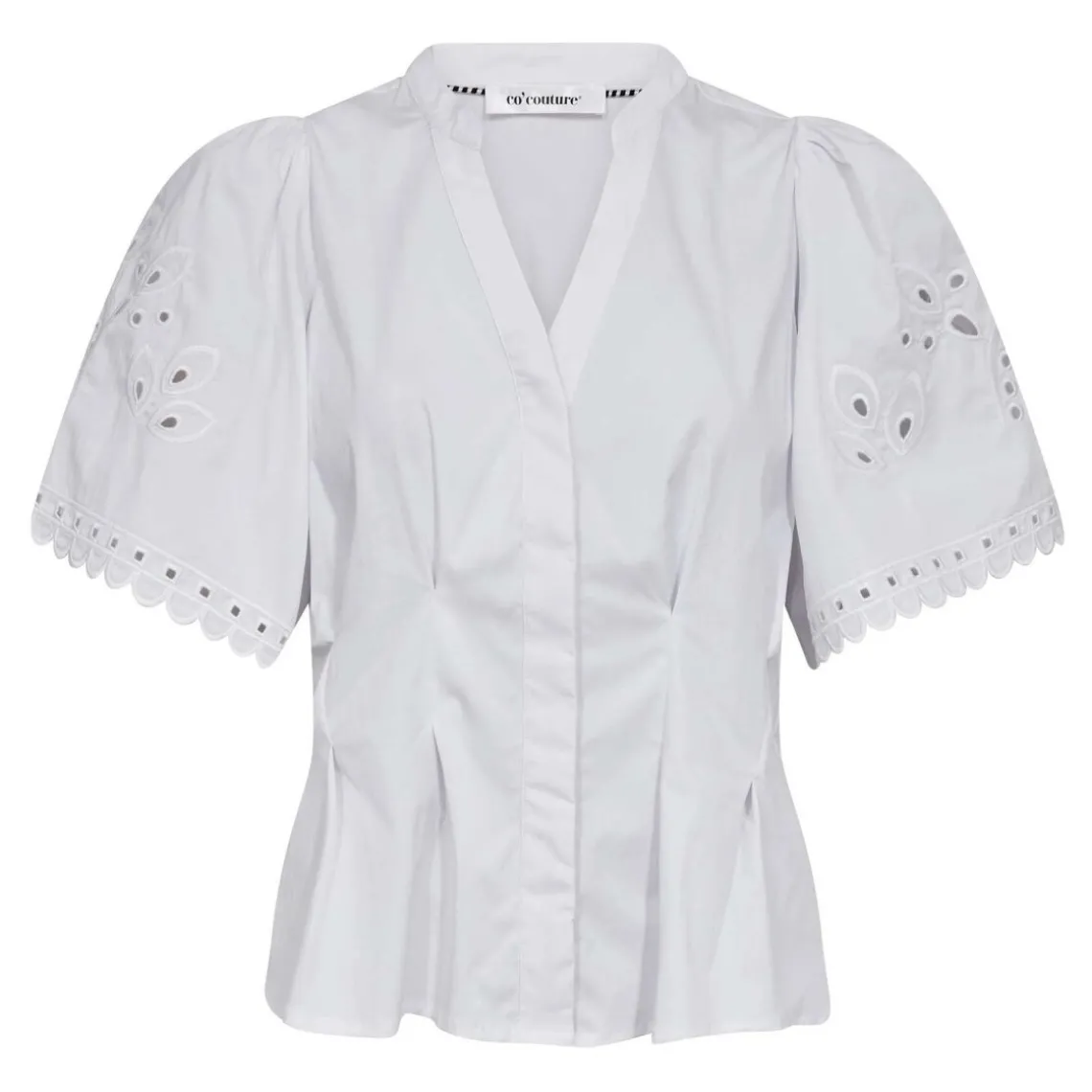 Denne hvide V‑shirt fra Co Couture kombinerer det klassiske t‑shirt‑look med feminine broderidetaljer og en flatterende V‑udskæring. Den har et enkelt, tidløst design, som gør den nem at style både til hverdagens casual outfits og til mere polerede looks. Broderiet tilføjer et subtilt og håndlavet udtryk, som løfter t‑shirten ud over det helt basale.