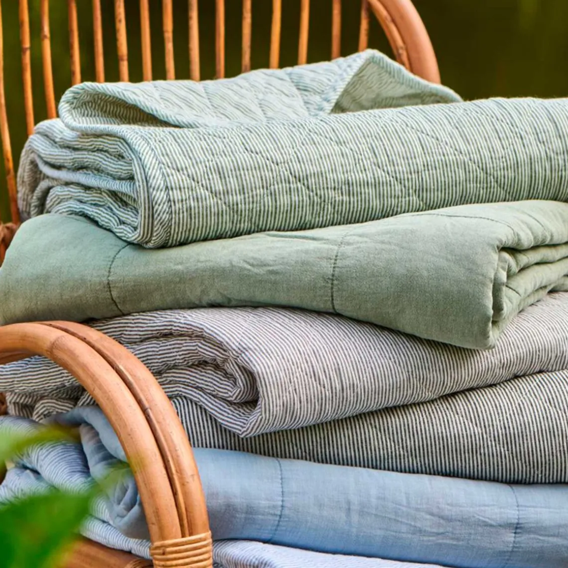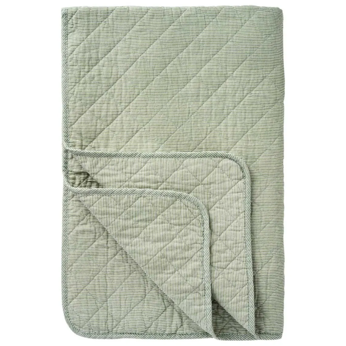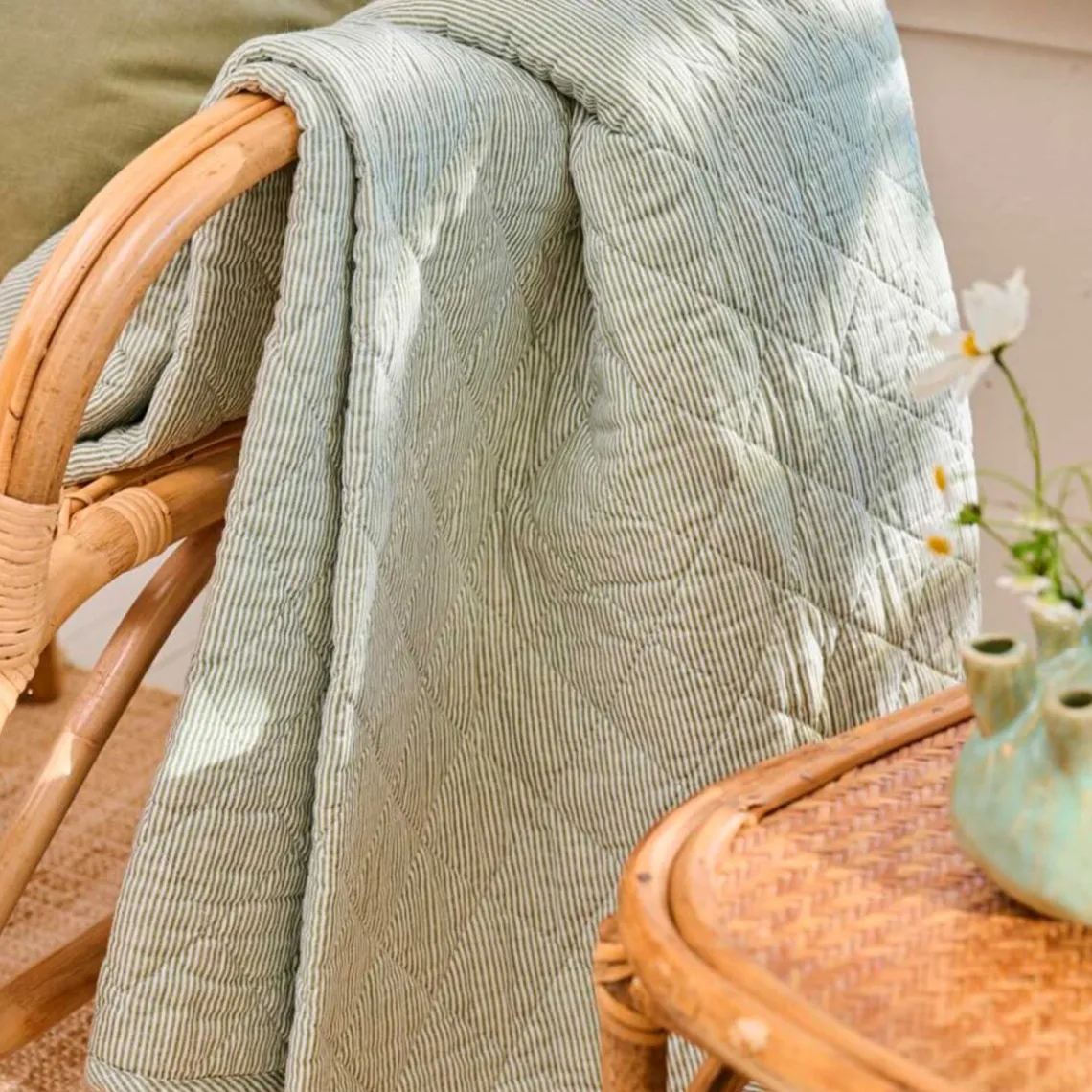 Lækkert, vatteret tæppe i blød bomuldskvalitet med klassiske mælkedrengestriber i hvid og støvgrøn. Tæppet har et tidløst udtryk, der passer smukt ind i både moderne og mere klassiske hjem, og den lette vattering gør det ideelt som ekstra lag på sofaen, i lænestolen eller på sengen.