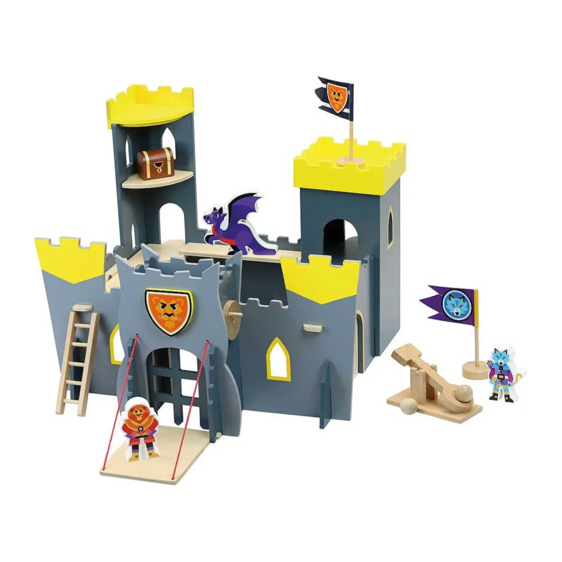 En super flot ridderborg i træ fra Vilac. Ridderborgen har både udkigstårn, vindebro, stige og medfølgende figurer som skattekiste, drage og riddere. Borgen er lavet i en fin grå farve og med guld detaljer. Sættet bliver leveret usamlet.